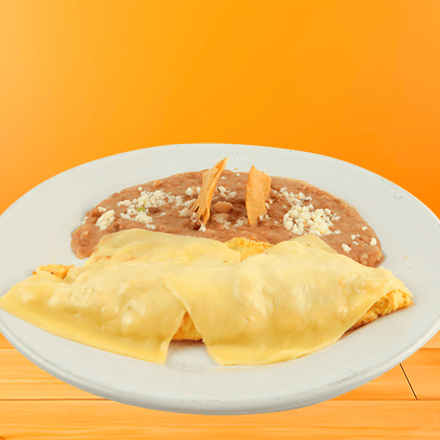 Omelette de dos huevos con queso mozarella gratinado preparado con tres ingredientes a tu gusto: jamón, salchicha, tocino, chorizo, champiñones, jitomate, cebolla, pimiento morrón amarillo, con frijoles refritos. Incluye tortillas de comal.