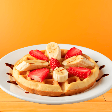Un waffle preparado con nuestra deliciosa pasta de la casa, acompañado con plátano y fresa bañado con chocolate o mermelada, o miel maple.