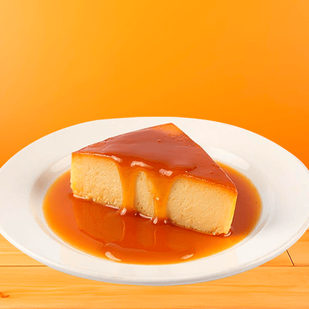 Rebanada de Flan napolitano cremoso con suave sabor a vainilla y toque de caramelo.