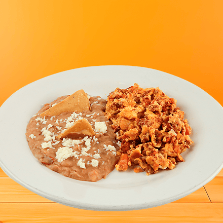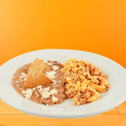 Dos huevos revueltos al gusto preparado con dos ingredientes: jamón, salchicha, tocino, chorizo, champiñones, jitomate, cebolla o pimiento morrón amarillo, con frijoles refritos. Con tortillas de comal hechas a mano.