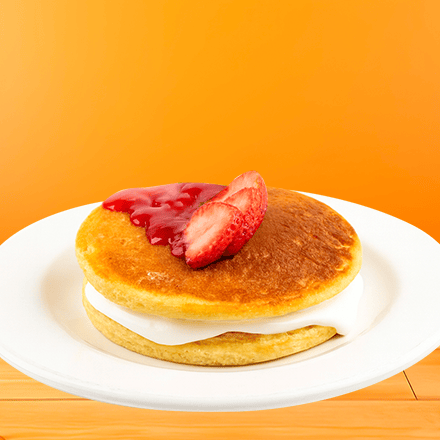 Dos hot cakes esponjosos preparados con nuestra deliciosa receta de la casa, acompañado con plátano y fresa bañados en chocolate o mermelada, o miel maple.
