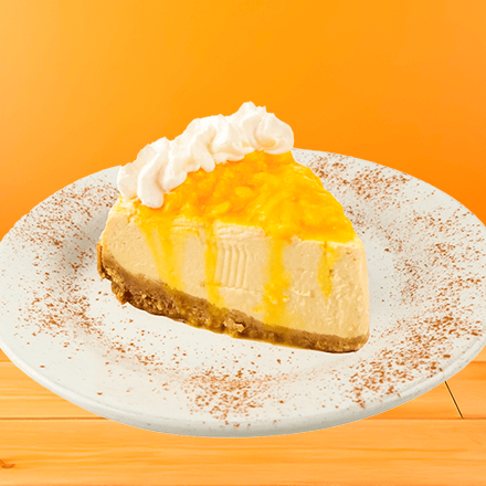 Rebanada de Cheesecake cremoso con base de galleta y suave glase de durazno.