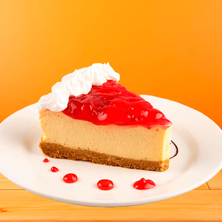 Rebanada de Pay de queso cremoso con base de galleta y glase de fresa.