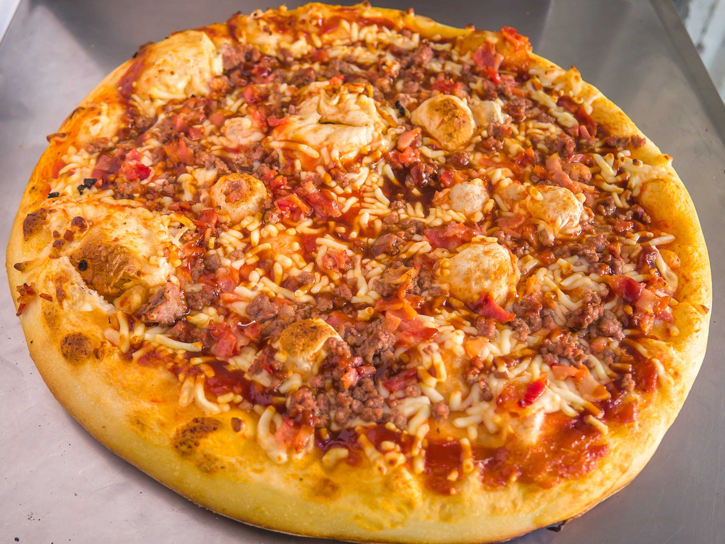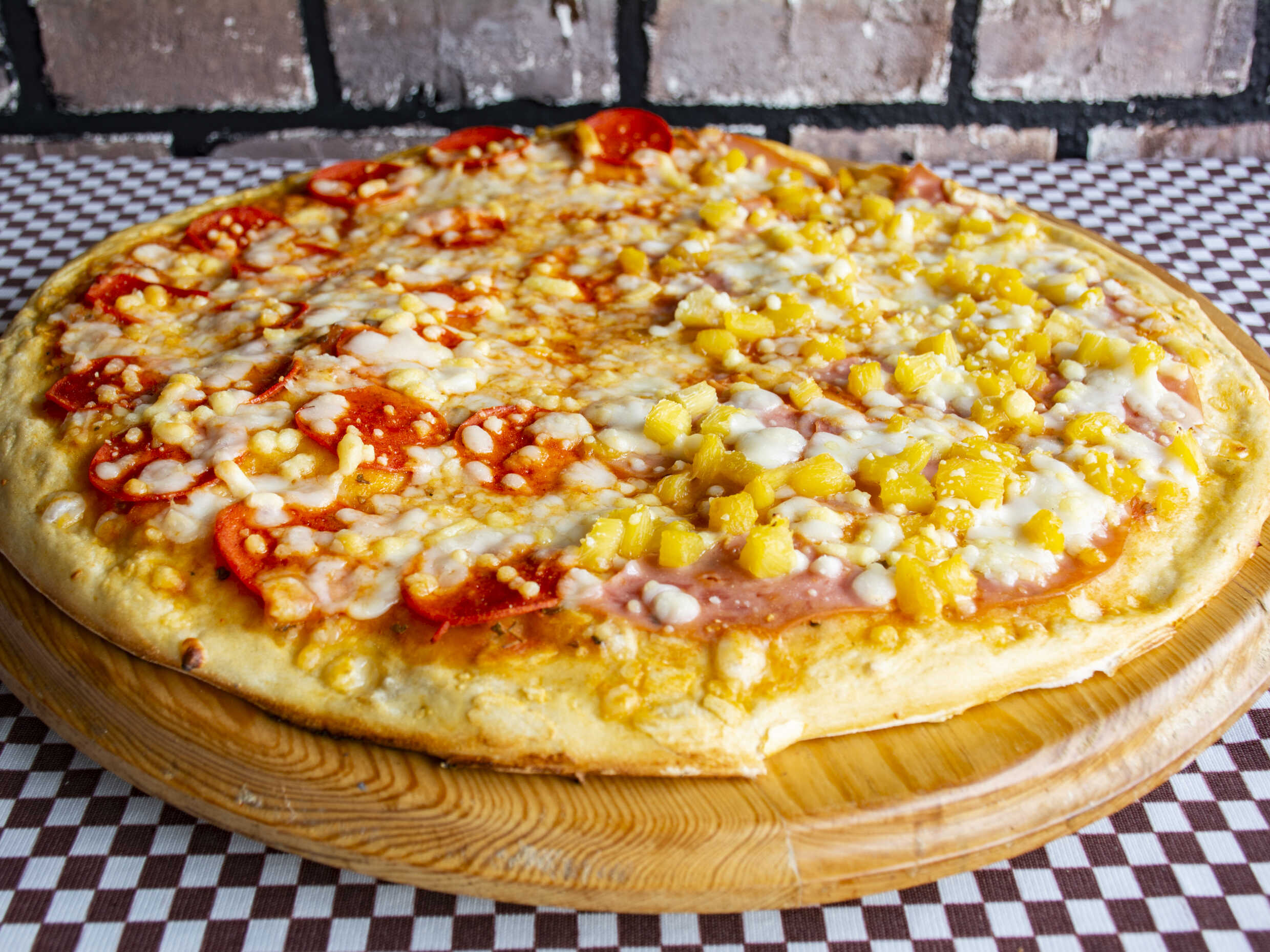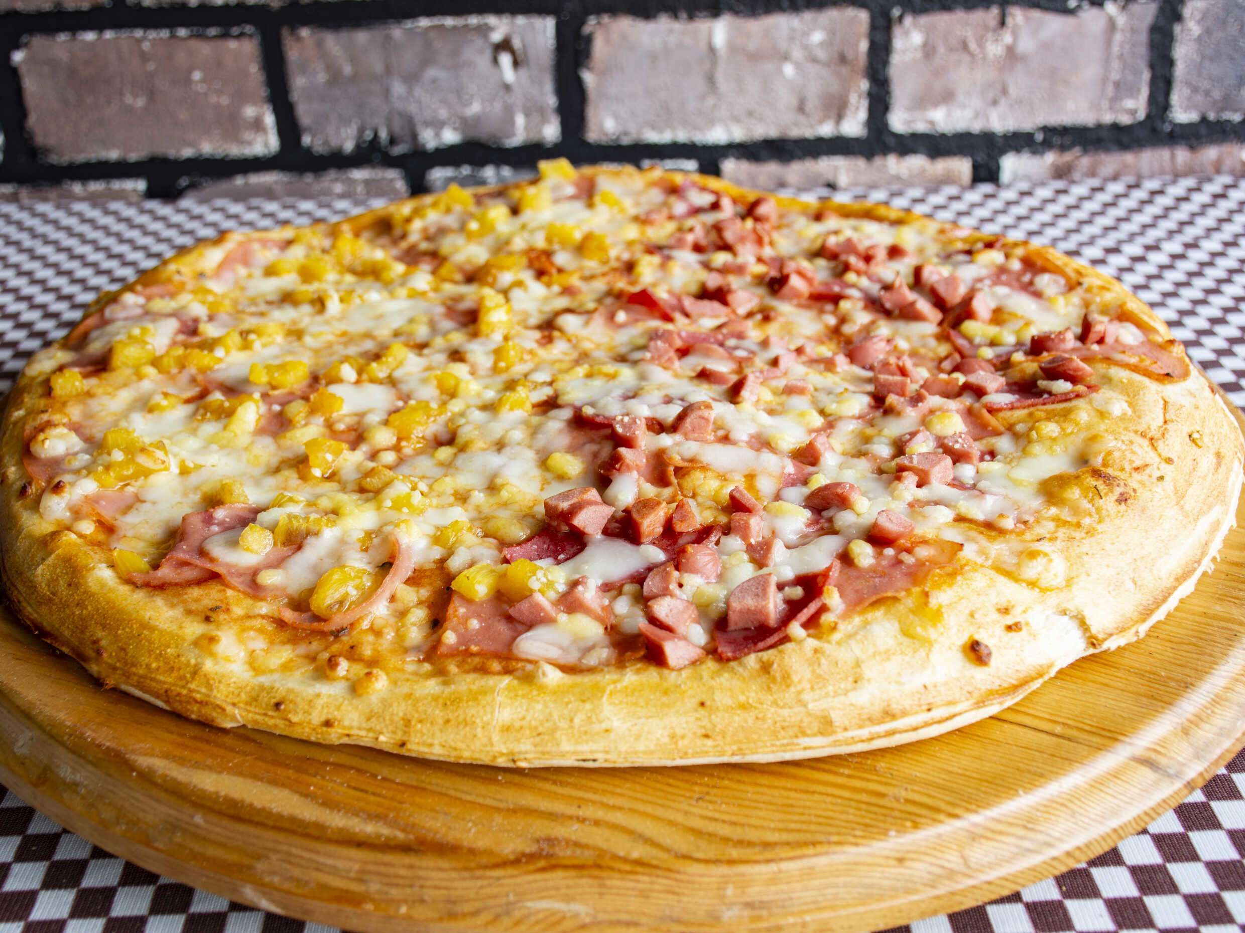 Pizza grande38c Mitad Hawaiana, mitad carnes frias