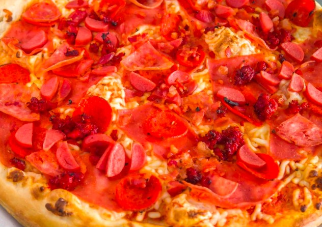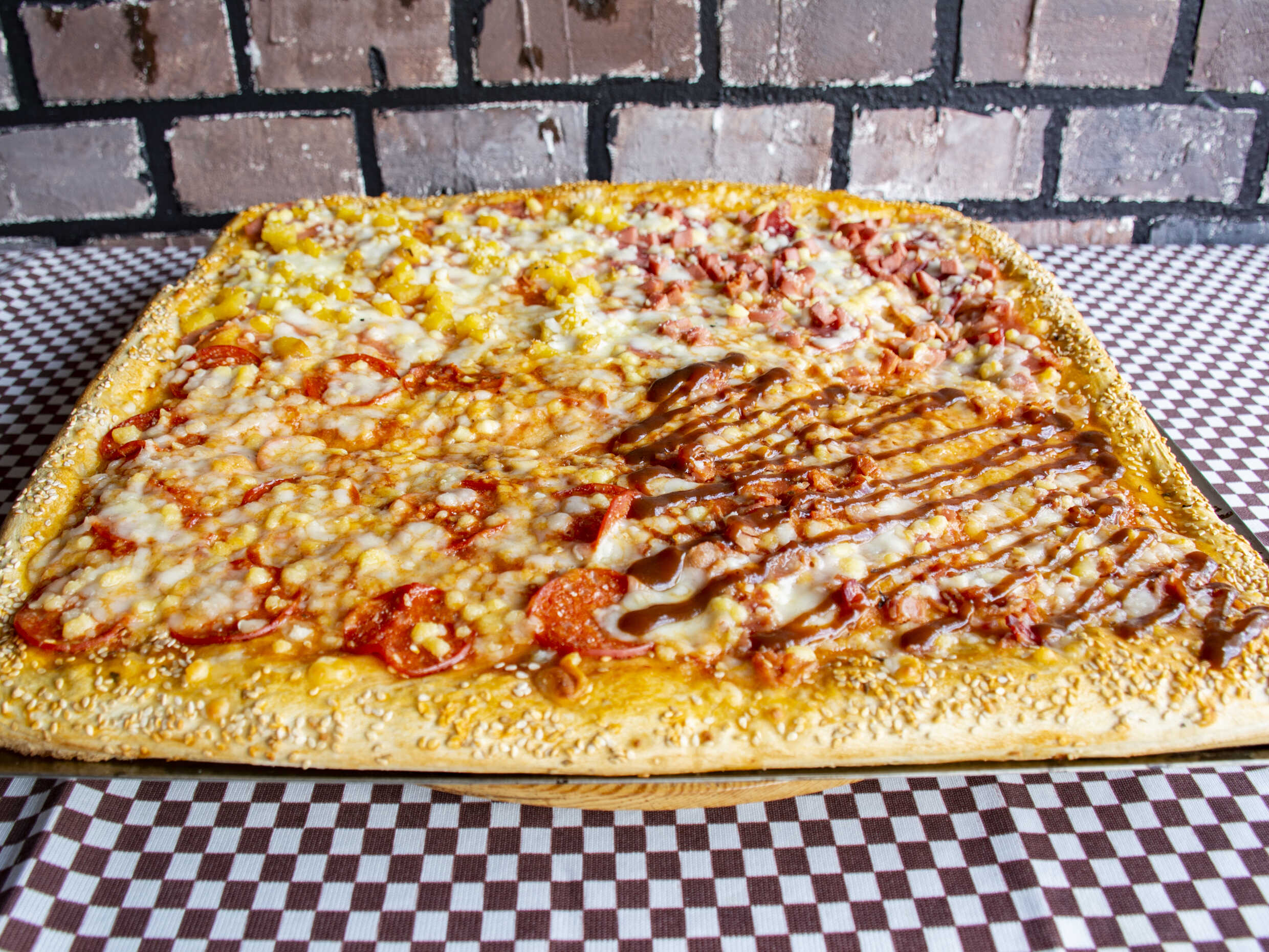 Jamón, salami, pepperoni, molida, salchicha y tocino. 45x45 cm cuadrada 16 porciones