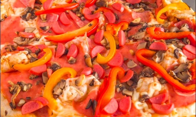 Jamón, salami, cebolla, morrón, salchicha y champiñones 45x45 cm 16 porciones