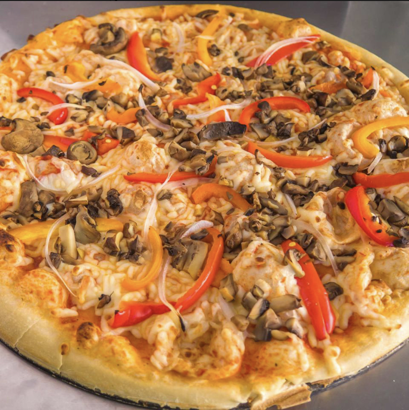 Jamón, piña, chorizo y champiñones.45x45 cm cuadrada 16 porciones
