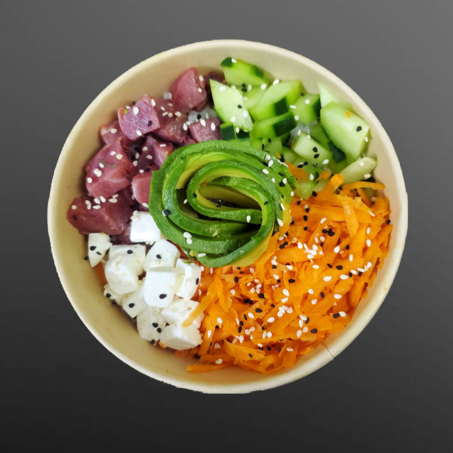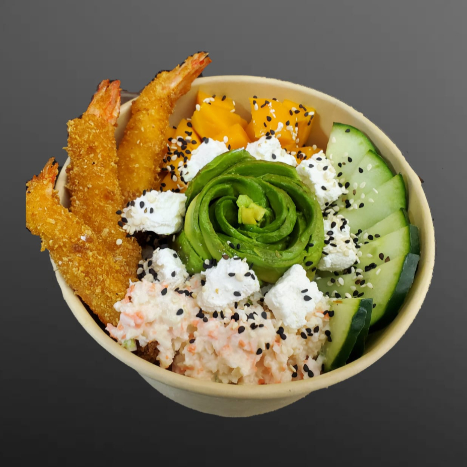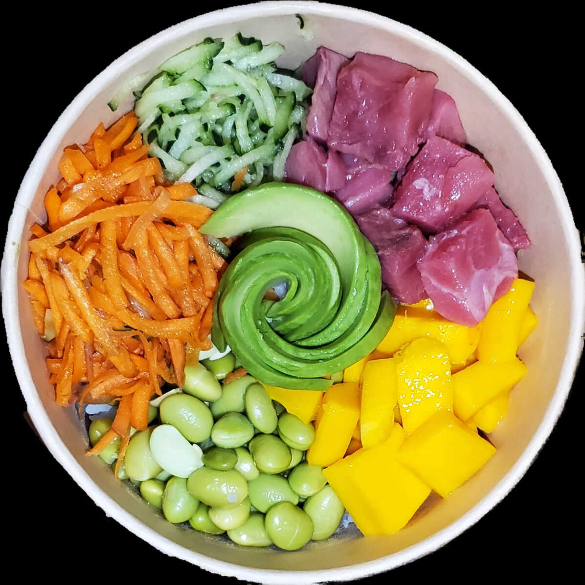 Fresca combinación de arroz shari al vapor con atún fresco de primera, mango dulce, pepino, aguacate, zanahoria y edamames. Acompañado de dip chipotle y salsa soya.