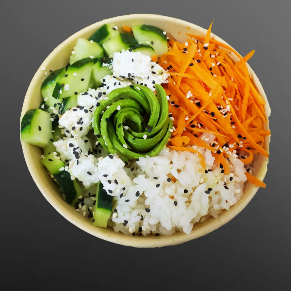 Delicioso arroz shari al vapor acompañado de pepino fresco, aguacate cremoso, zanahoria, queso Philadelphia, ensalada tampico, edamames y un toque de ajonjolí. Servido con salsa Sriracha y soya.