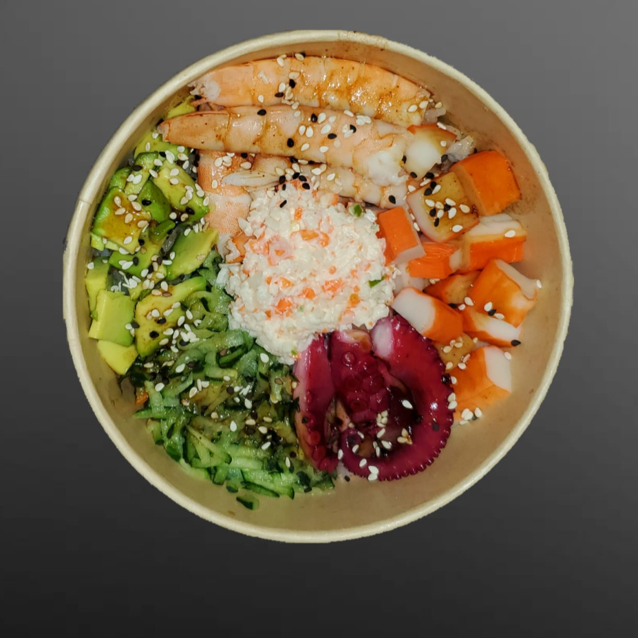 Especialidad marina con arroz shari al vapor, camarón, pulpo, cangrejo, pepino, aguacate y ensalada tampico con ajonjolí. Incluye dip Sriracha y salsa soya.