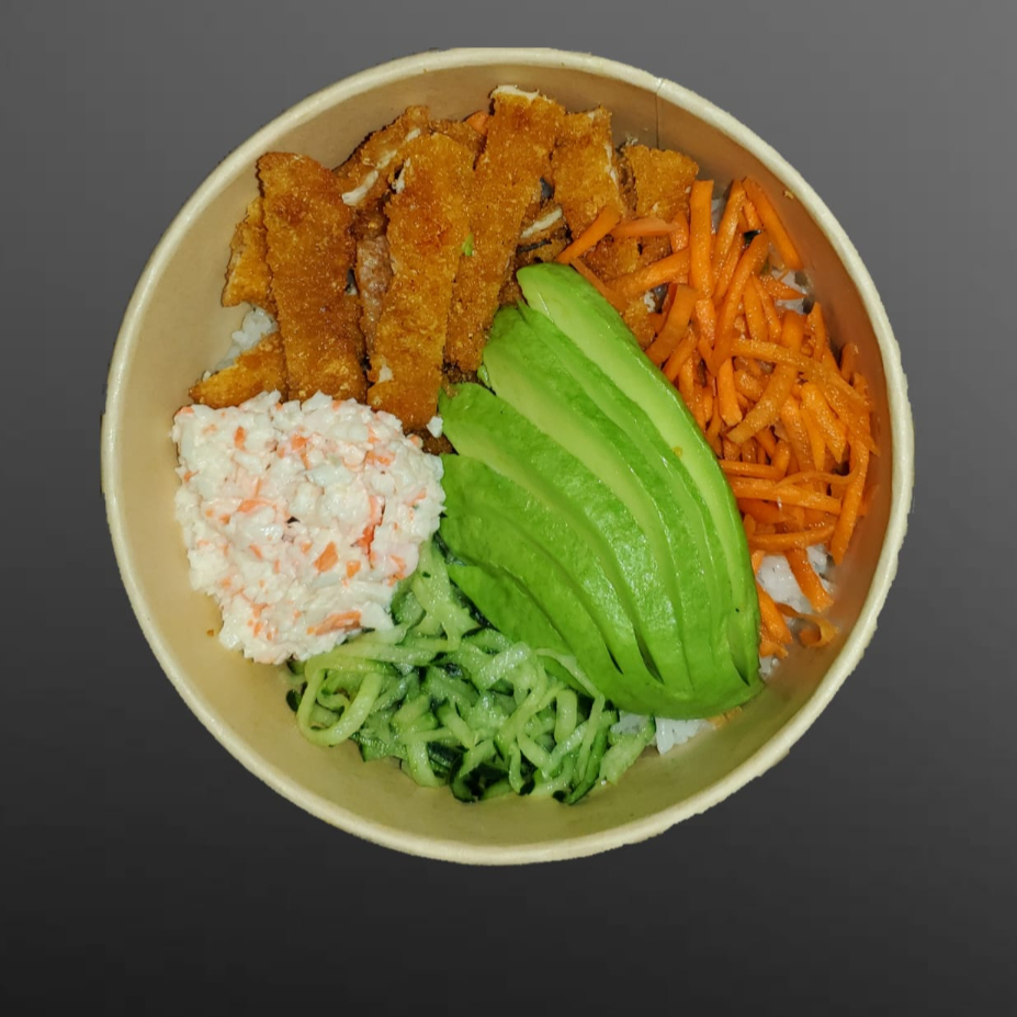 Bowl de arroz shari al vapor con pollo empanizado crujiente, pepino, ensalada tampico, aguacate y zanahoria. Incluye dip chipotle y salsa soya por separado.