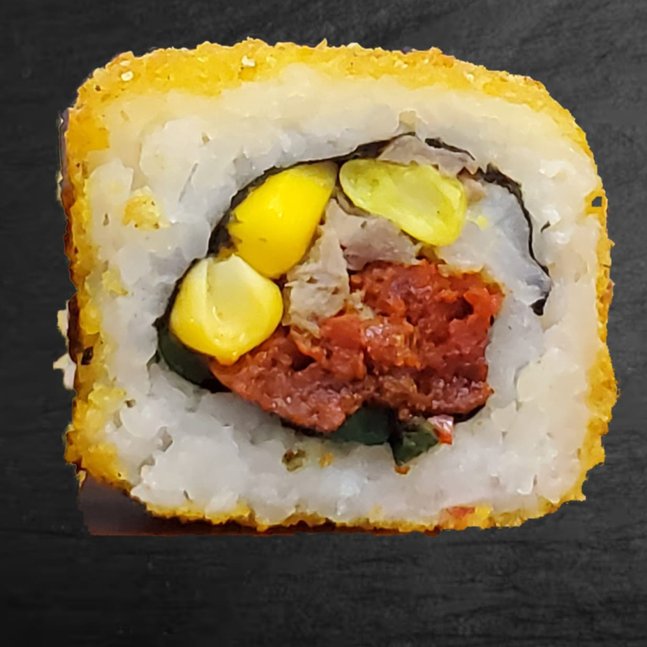 ROLLO DE 10 PIEZAS RELLENO DE ALGA, RES, CHORIZO, TIRAS DE CHILE POBLANO Y ELOTE AMARILLO. POR FUERA EMPANIZADO CON DIP CHIPOTLE APARTE.