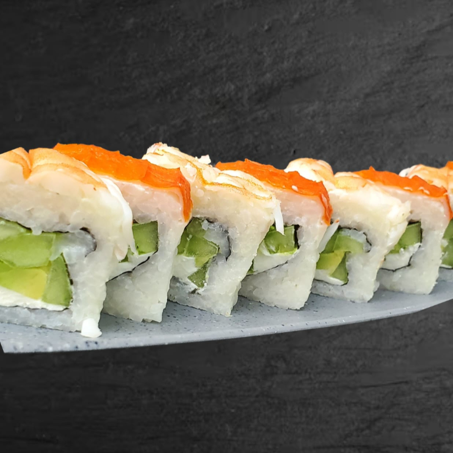 DRIQUISIMO ROLLO DE 10 PIEZAS RELLENO DE QUESO PHILADELPHIA, AGUACATE Y PEPINO. CUBIERTO DE CAMARON Y CANGREJO