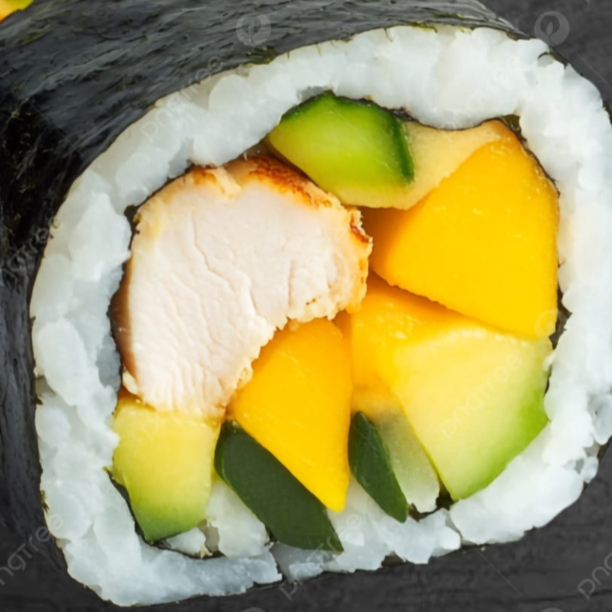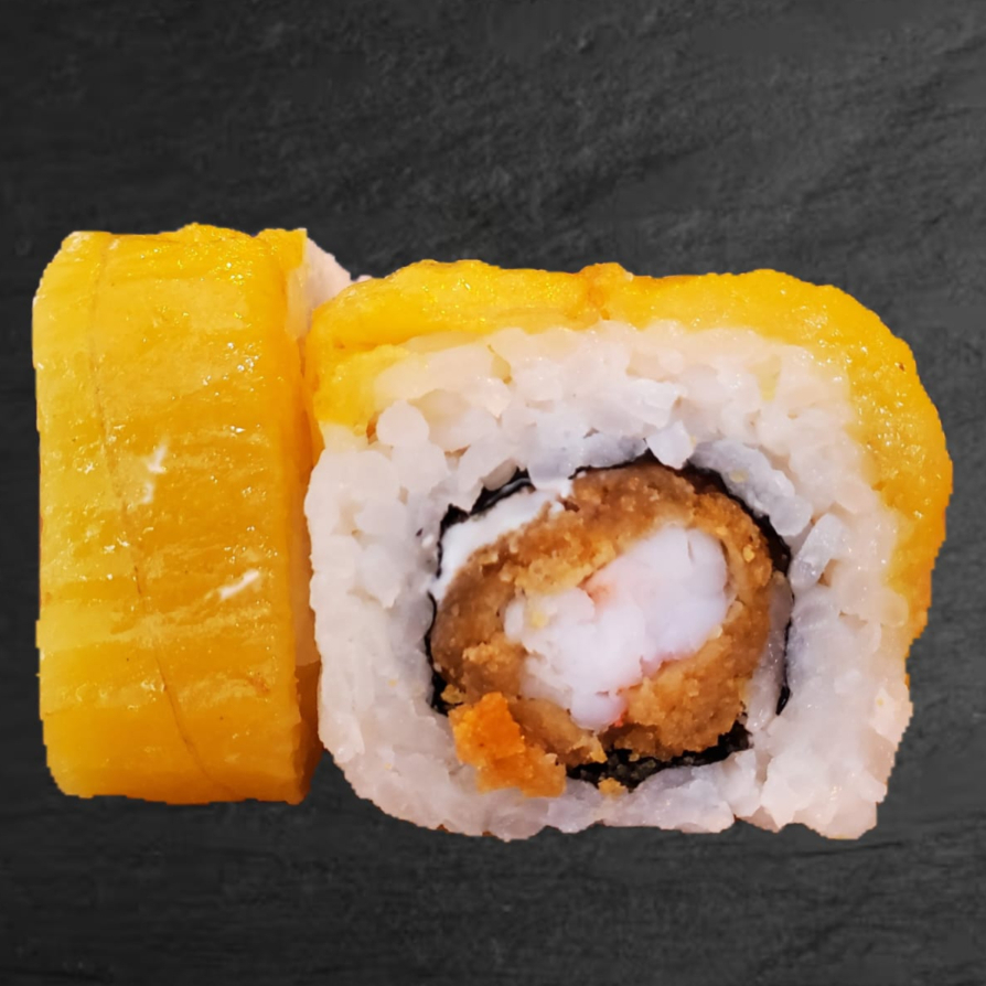 DELICIOSO ROLLO DE 10PIEZAS RELLENO DE CAMARON EMPANIZADO, MANGO Y QUESO PHILADELPHIA. CUBIERTO DE ALGA NORYNIZADO, AGUACATE,