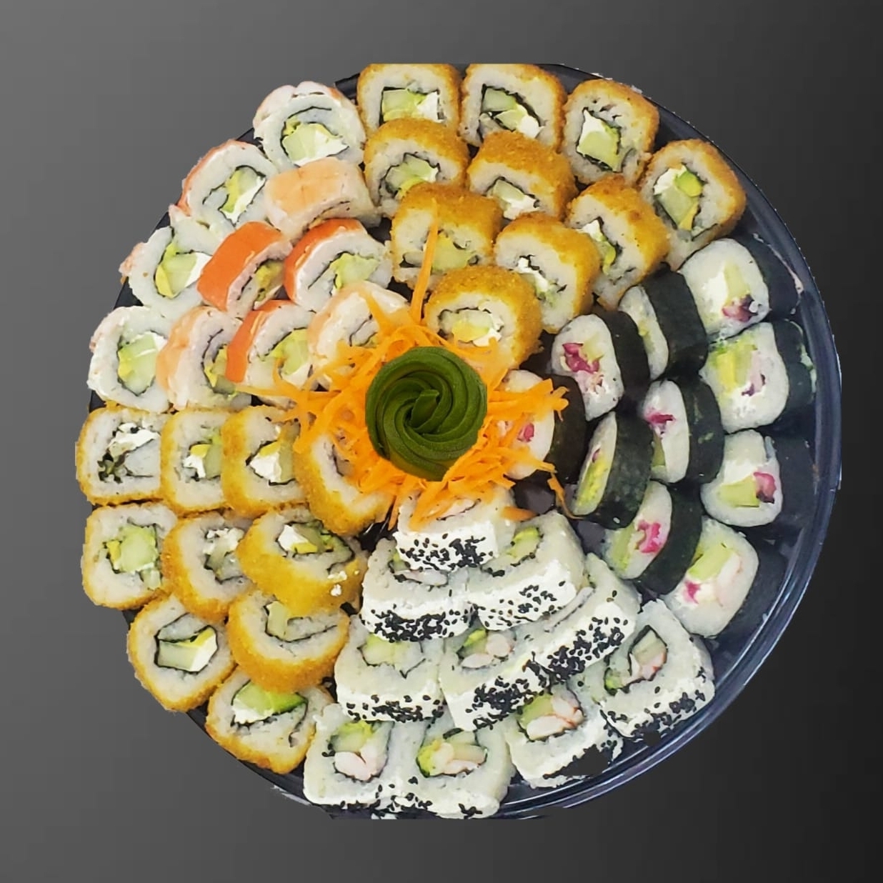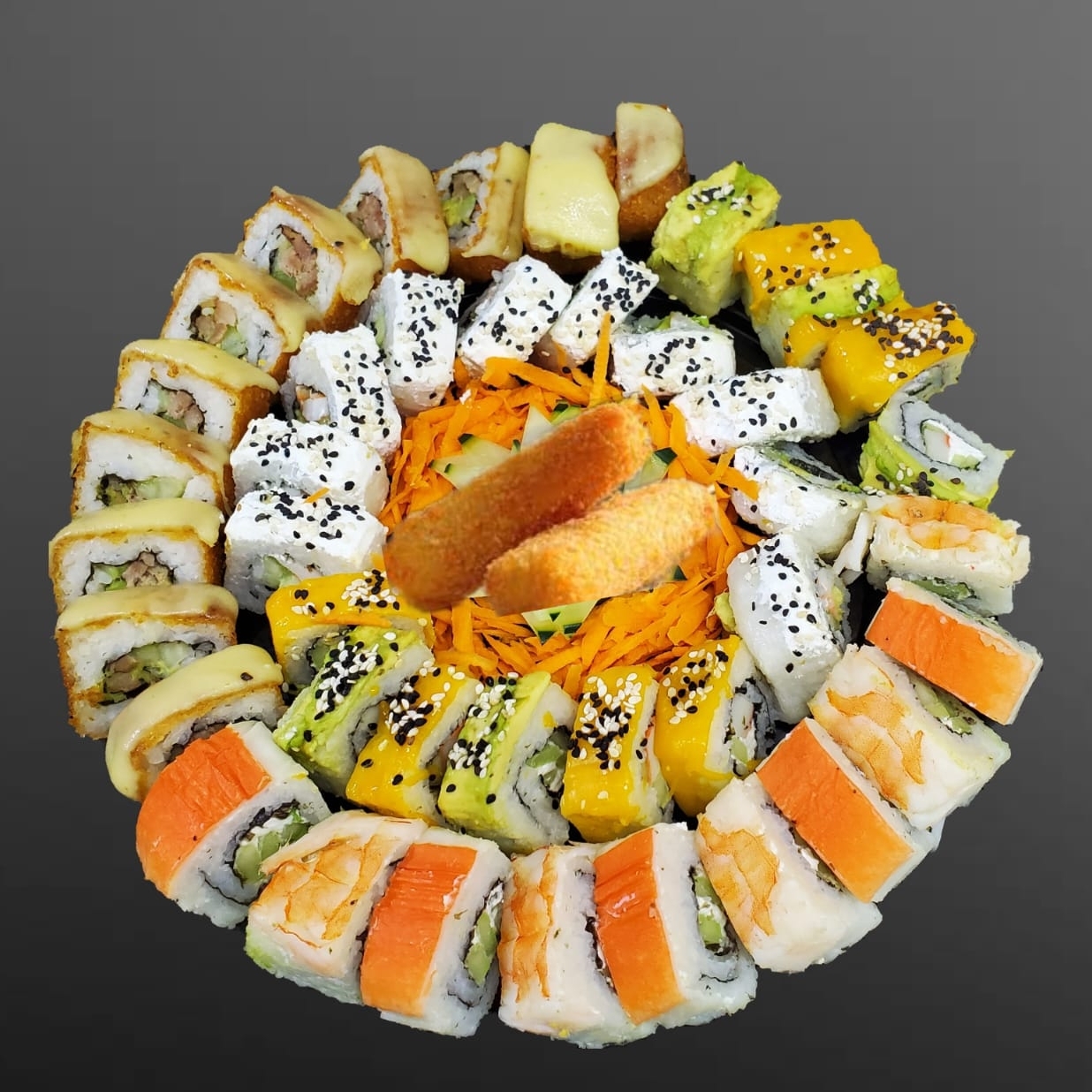 Gran charola para compartir: 10 pzas cama suri, 10 pzas mar y tierra, 10 pzas tropical mang, 10 pza california roll y 1 sushi ball. Incluye soya, dip chipotle y anguila.