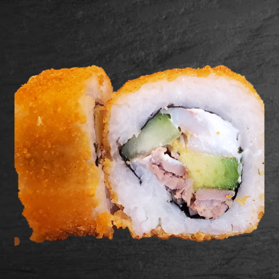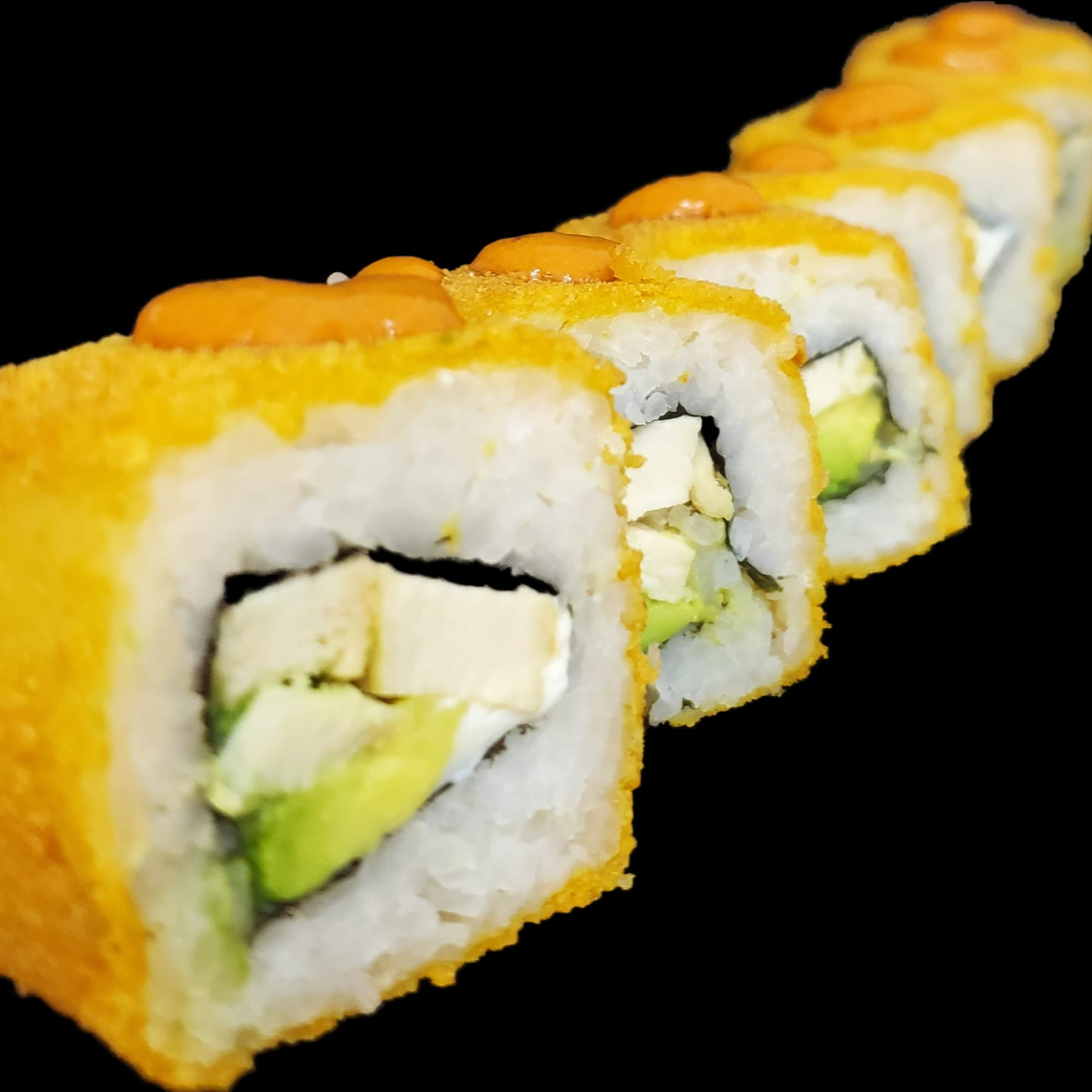 ROLLO DE 10 PIEZAS RELLENO DE ALGA, PECHUGA DE POLLO ZAZONADA, QUESO PHILADELPHIA Y AGUACATE. POR FUERA EMPANIZADO Y DIP CHIPOTLE