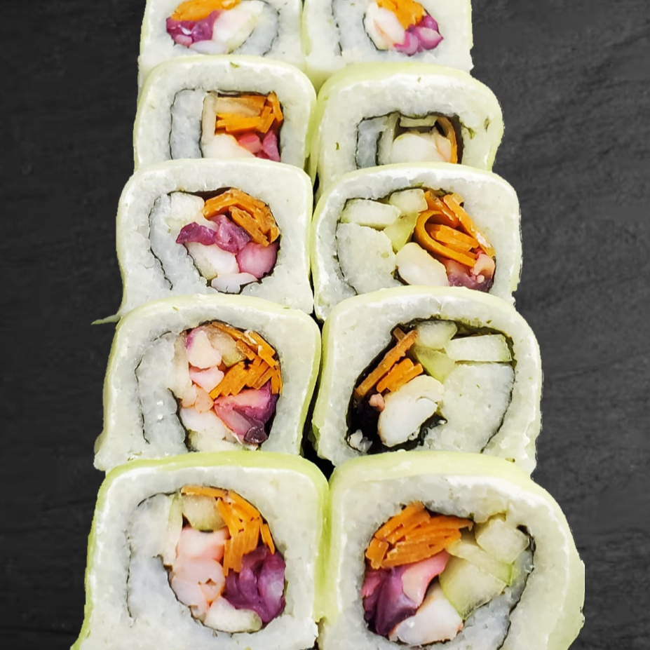 RIQUISIMO ROLLO DE 10PIEZAS RELLENO DE ALGA, CAMARON, PULPO, PEPINO Y ZANAHORIA. CUBIERTO CON PEPINO