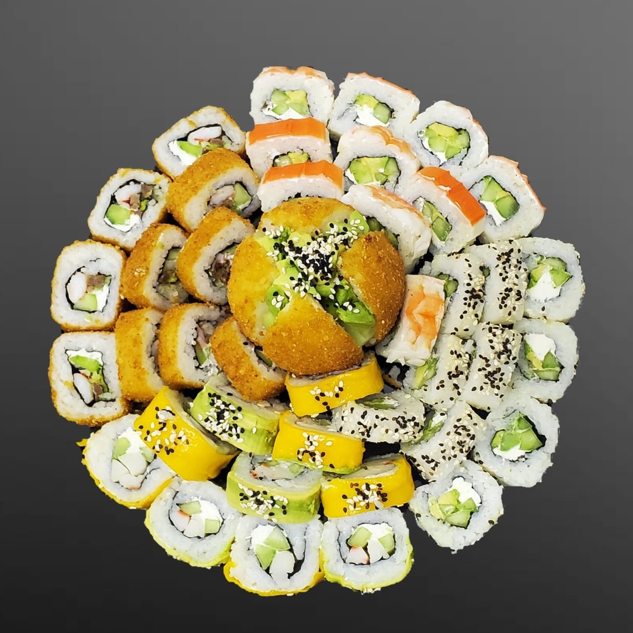 El festín definitivo: 5 rollos de sushi a tu elección (10 piezas cada uno). Ideal para reuniones y amantes del sushi.