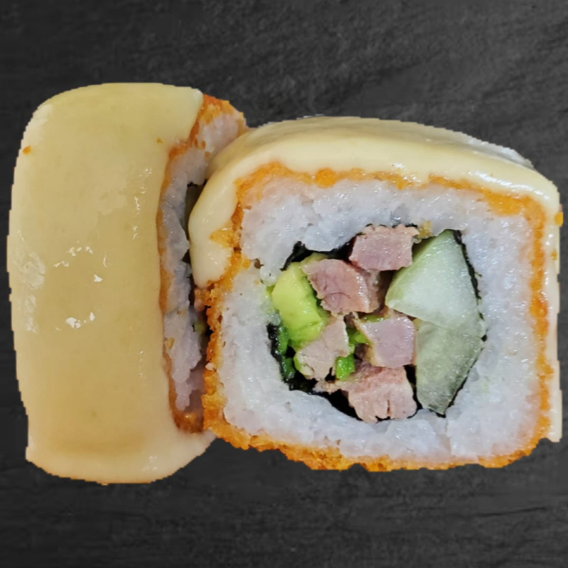 ROLLO DE 10 PIEZAS RELLENO DE ALGA BISTEC DE RES MARINADA PEPINO Y AGUACATE CUBIERTA EMPANIZADA CON QUESO MANCHEGO GRATINADO Y DIP CHIPOTLE.