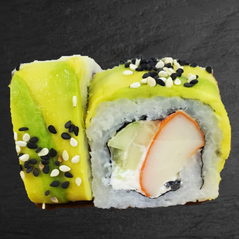 DELICIOSO ROLLO DE 10 PIEZAS RELLENO DE ALGA, PEPINO, CANGREJO Y QUESO PHILADELPHIA. CUBIERTO DE AGUACATE Y UN TOQUE DE AJONJOLI