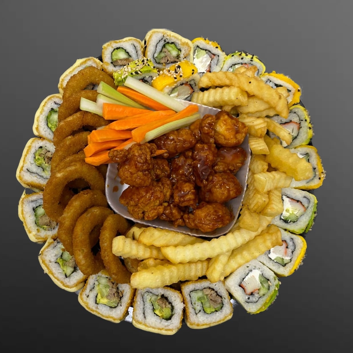 Variedad total: 2 sushis a elegir, papas a la francesa crujientes, aros de cebolla y boneless con salsa a elegir. Incluye aderezo ranch y soya.
