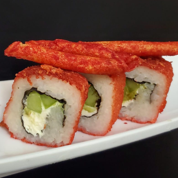 ROLLO DE 10 PIEZAS RELLLENO DE ALGA, PEPINO Y AGUACATE. CUBIERTO DE TAKIS FUEGO ORIGINAL INCLUYE DIP