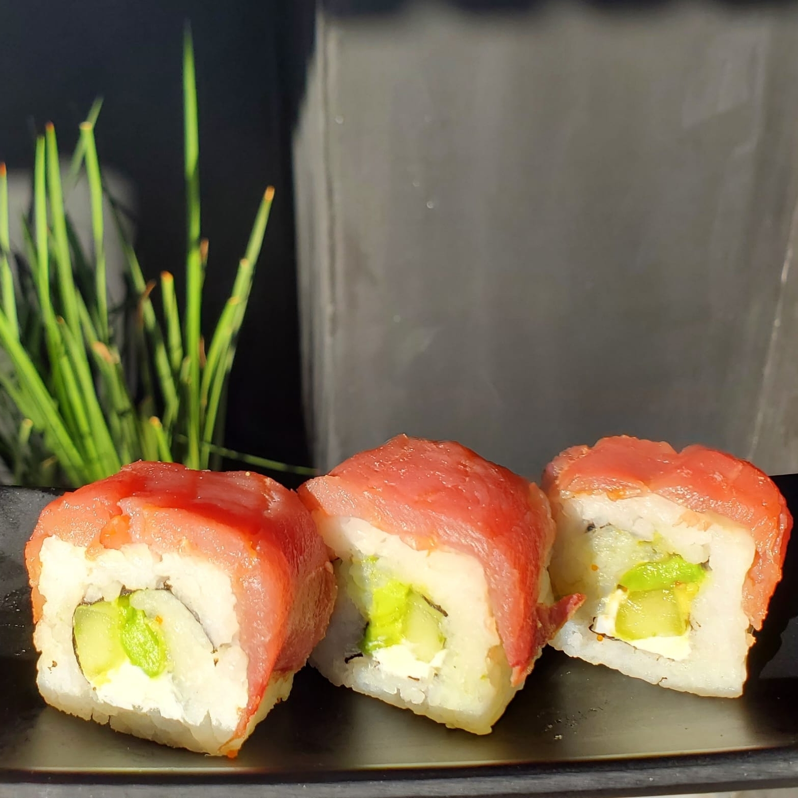 ROLLO DE 10 PIEZAS RELLENAS DE ALGA MARINA, QUESO PHILADELPHIA, PEPINO Y AGUACATE. CUBIERTO DE DELICIOSO ATUN FRECO