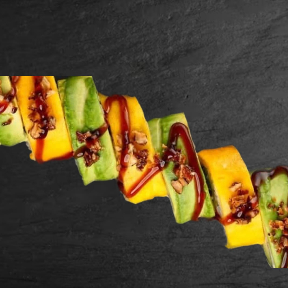 ROLLO DE ARROZ SHARI DE 10PIEZAS RELLENO DE QUESO PHILADELPHIA, CANGREJO Y PEPINO. CUBIERTO DE MANGO AGUACATE Y UN TOQUE DE AJONJOLI