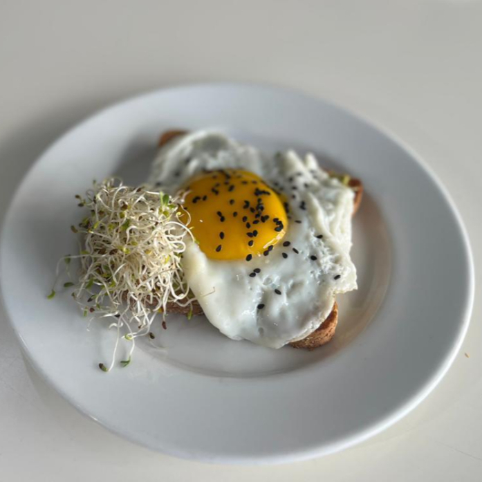 Pan tostado integral sobre una cama de aguacate con germen de alfalfa y huevo al gusto.