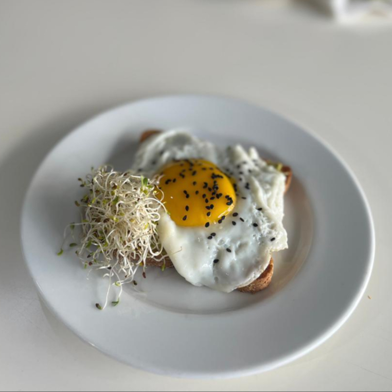 Pan tostado integral sobre una cama de aguacate con germen de alfalfa y huevo al gusto.