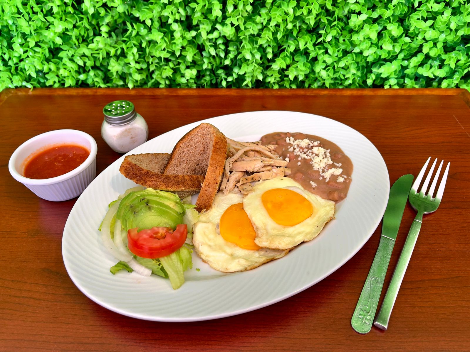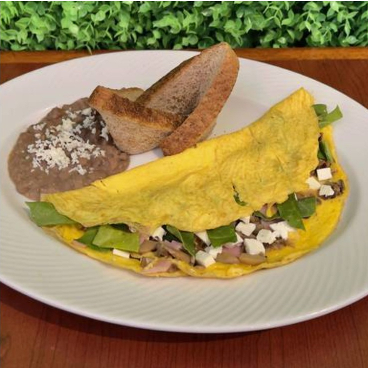 Champiñones, espinaca, jamón, queso panela con guarnición de frijoles.