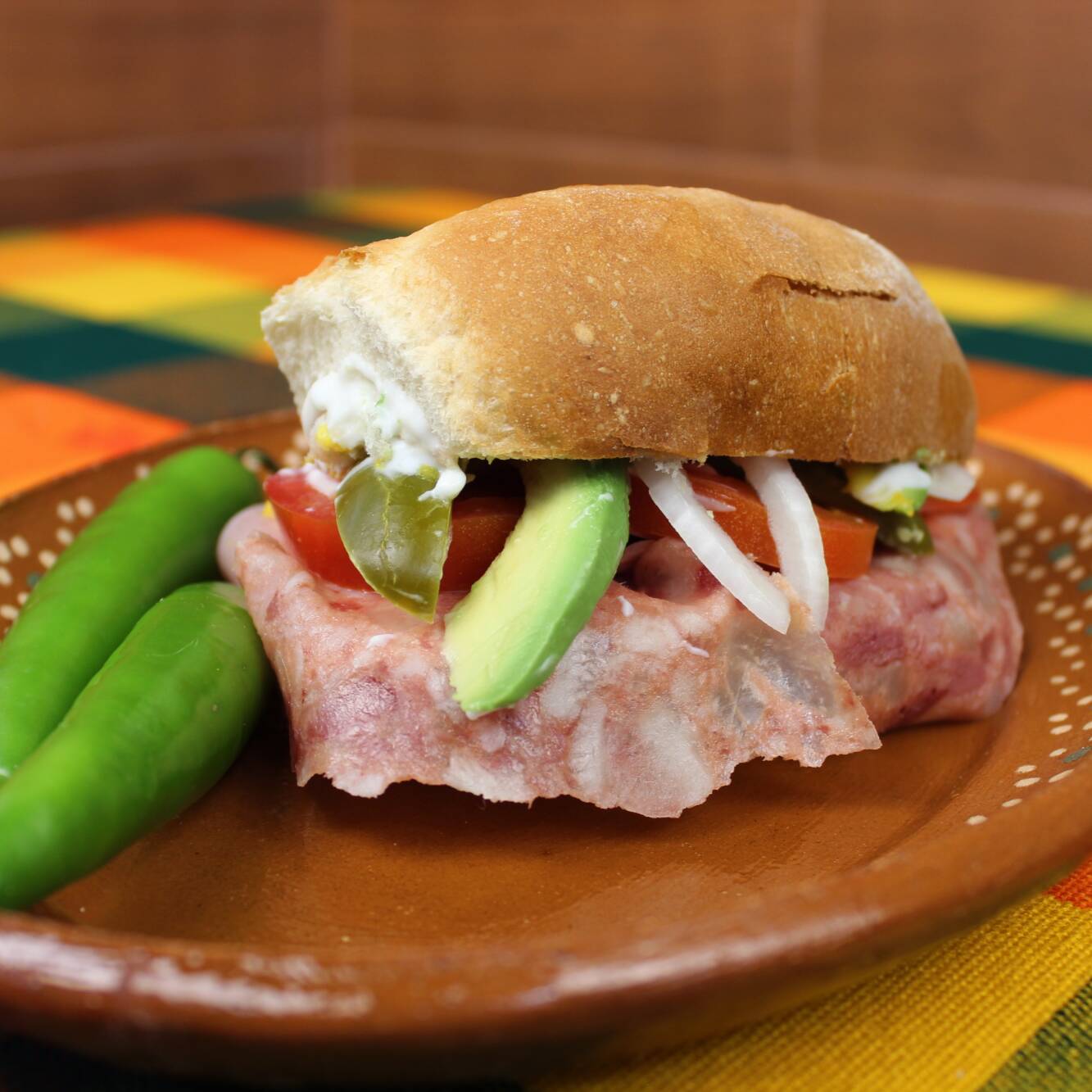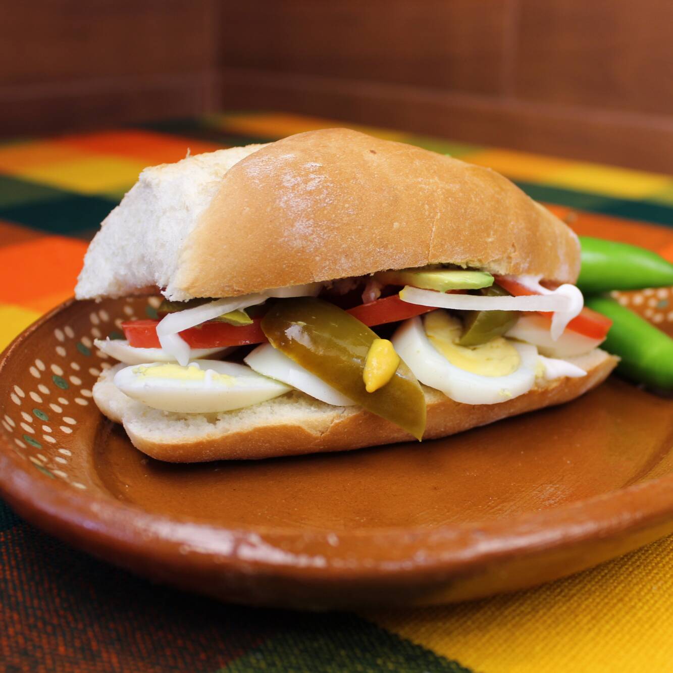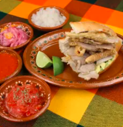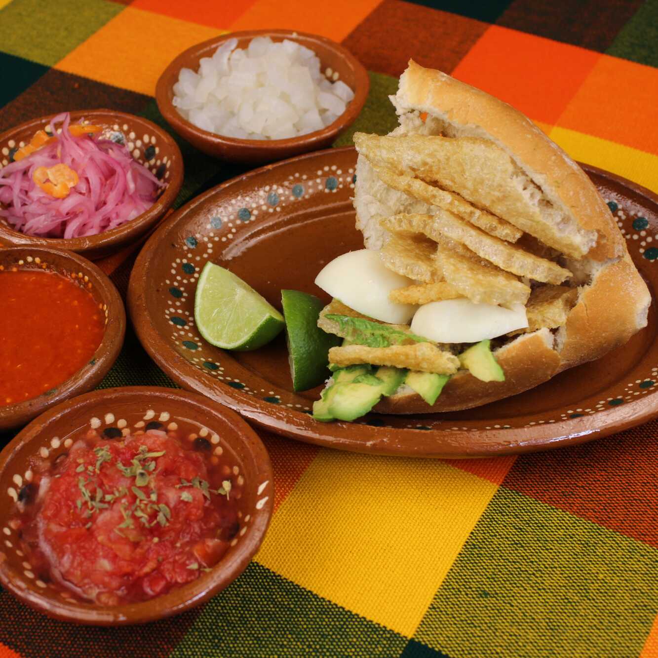 La más fuerte de la casa, con aguacate, huevo cocido, duro y taco dorado dentro del bolillo, acompañada por separado para que te sirvas a tu gusto con salsa picante de árbol, salsa sin picante tipo pico de gallo, cueritos, limón y cebolla morada en habanero.