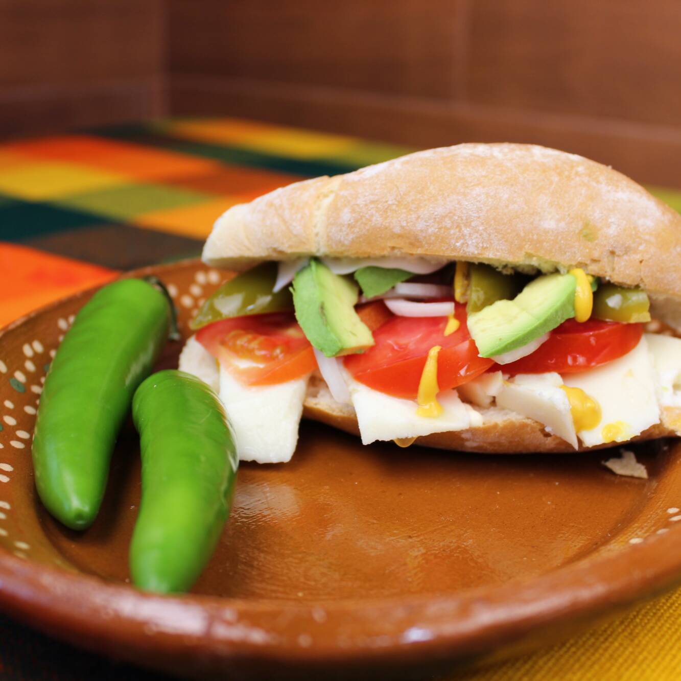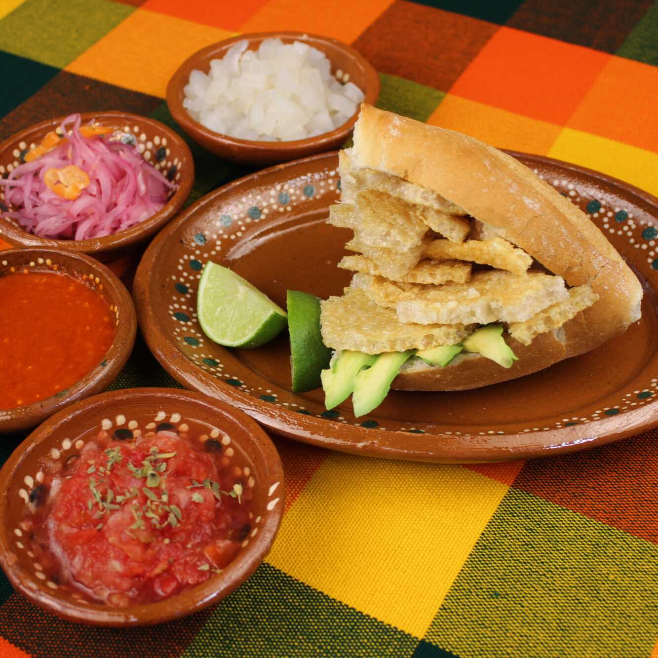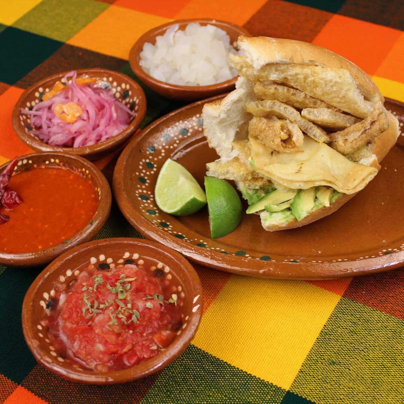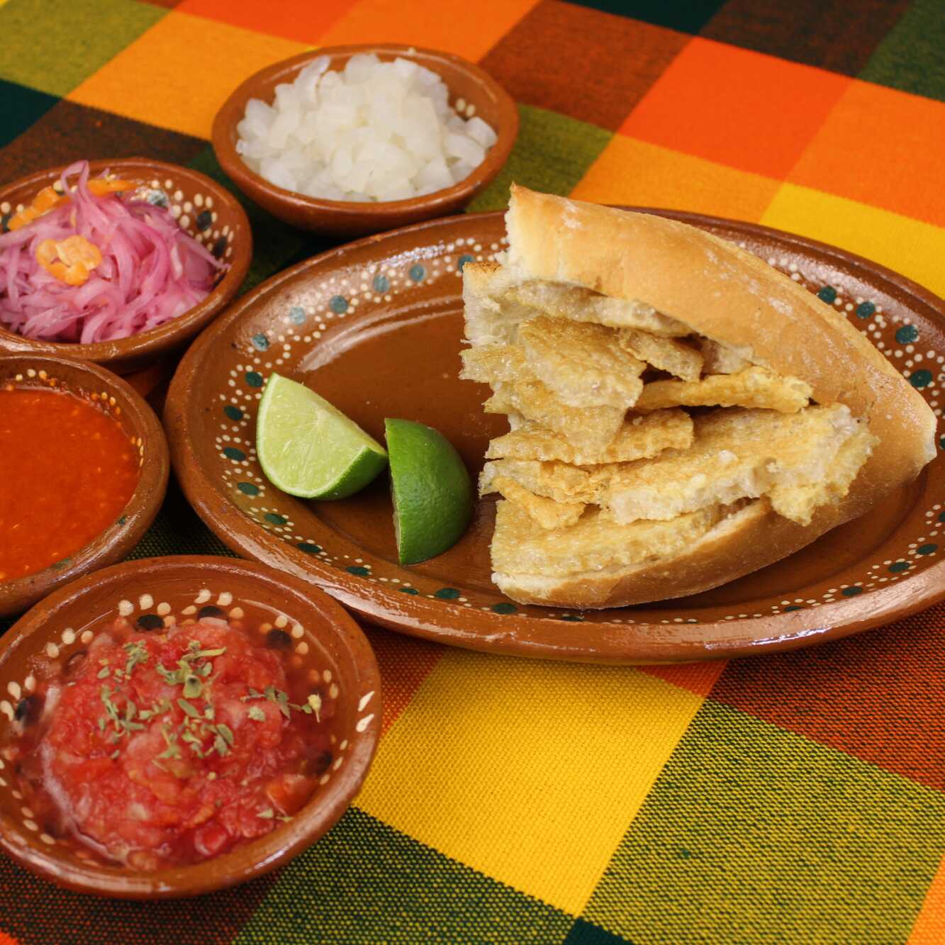 La que todos conocemos, bolillo con duro, acompañada para que te sirvas a tu gusto de salsa no picante tipo pico de gallo, salsa de chile de árbol, cueritos, cebolla morada desflemada en habanero y limón.