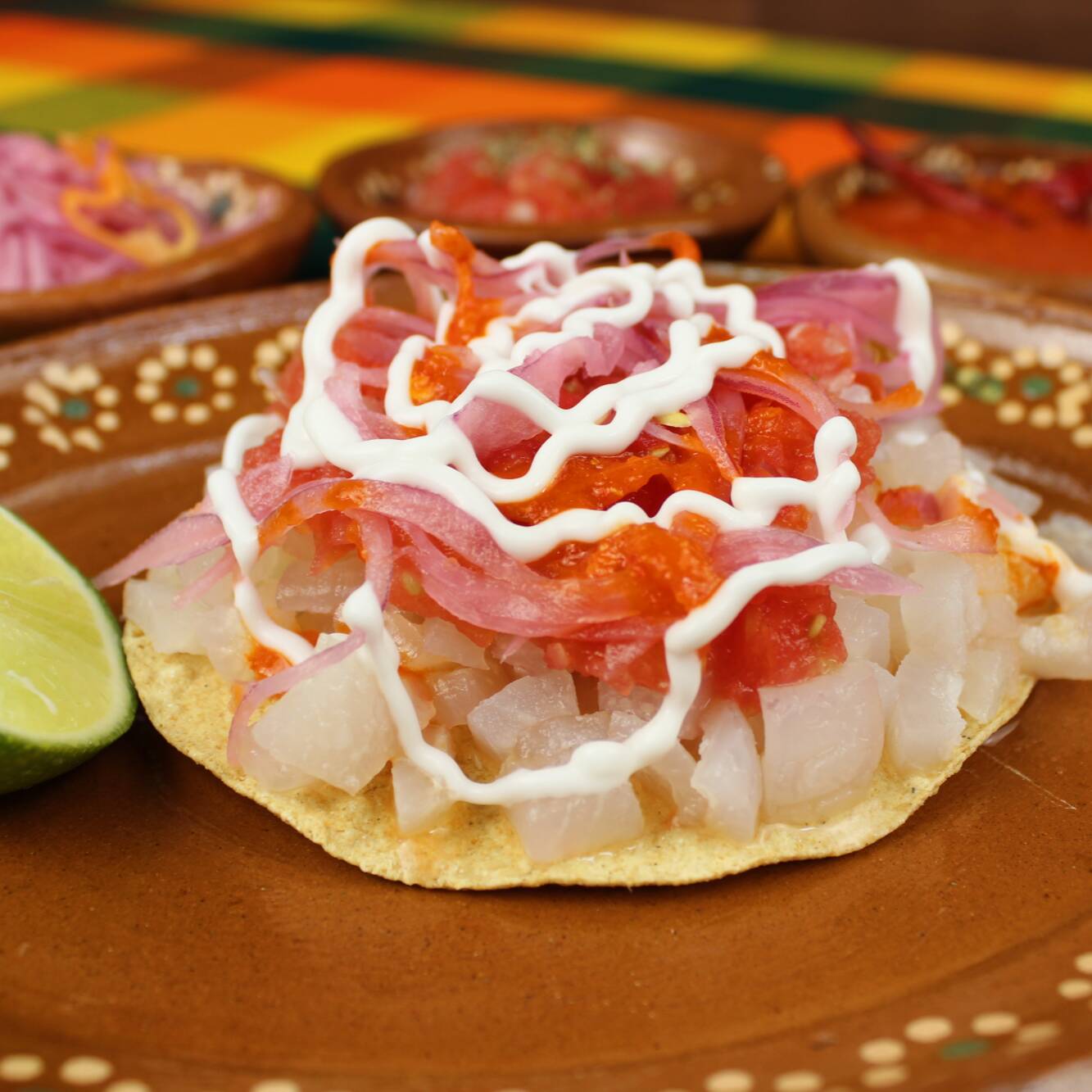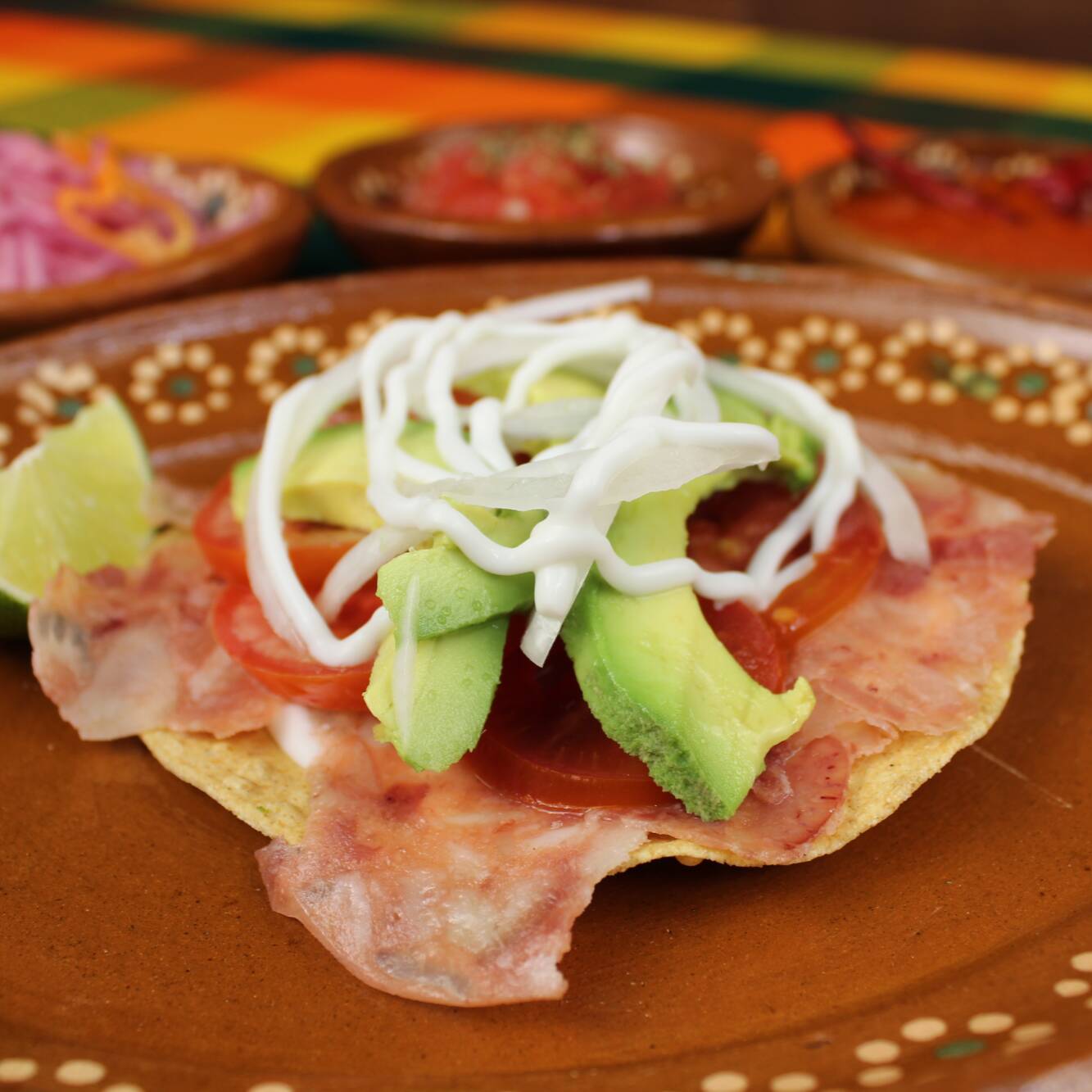 Acompañado con aguacate y tártara por separado para que te sirvas a tu gusto con salsa picante de árbol, salsa sin picante tipo pico de gallo, cueritos, limón, cebolla morada en habanero y cremita.