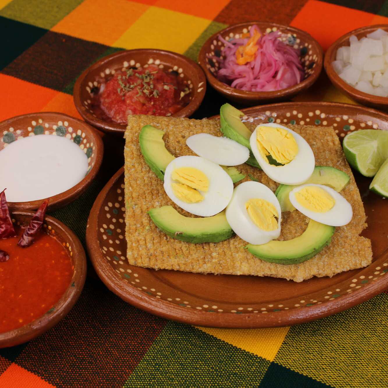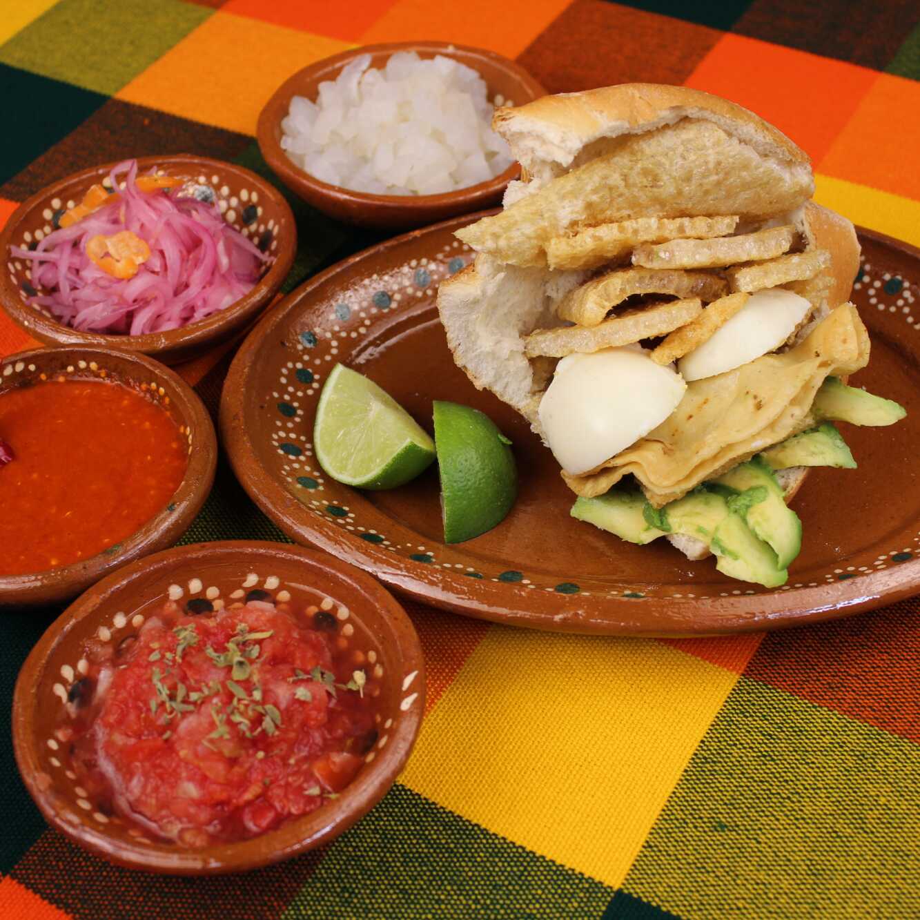 Sabrosa combinación de aguacate con huevo cocido además de duro en el bolillo, acompañada por separado para que te sirvas a tu gusto con salsa picante de árbol, salsa sin picante tipo pico de gallo, cueritos, limón y cebolla morada en habanero.
