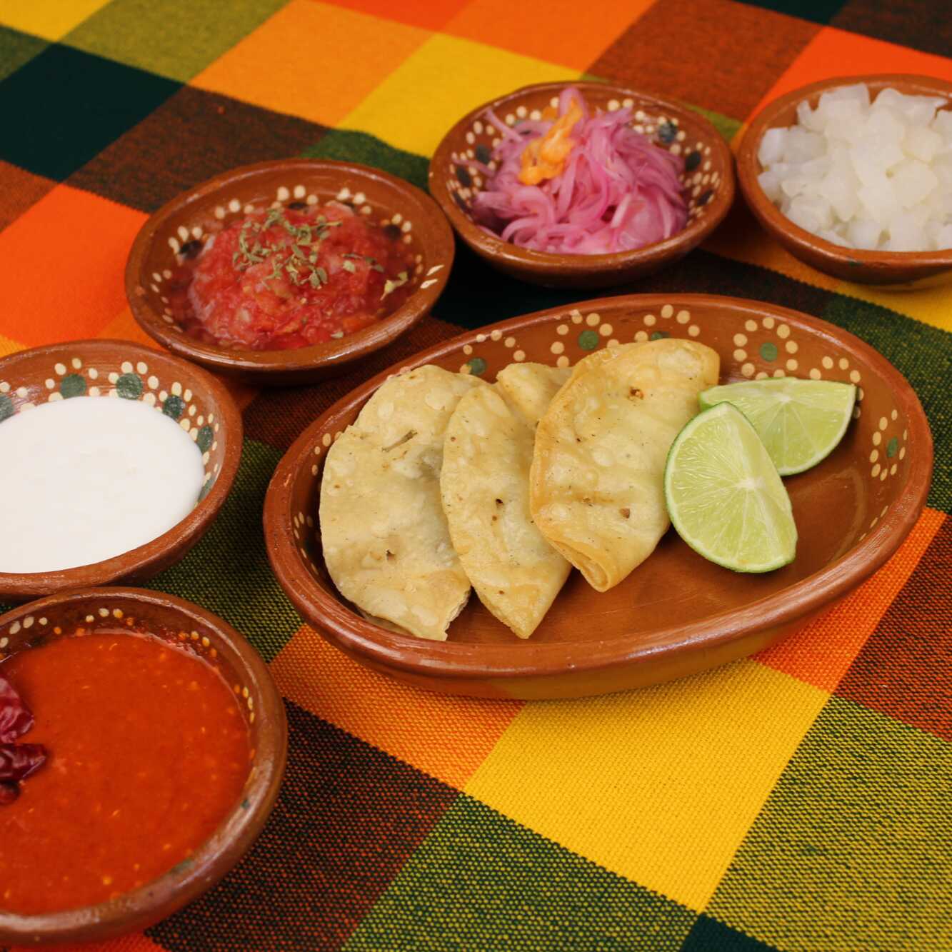 3 Tacos sencillos con relleno a tu elección, acompañados por separado para que te sirvas a tu gusto con salsa picante de árbol, salsa sin picante tipo pico de gallo, cueritos, limón, cebolla morada en habanero y cremita.
