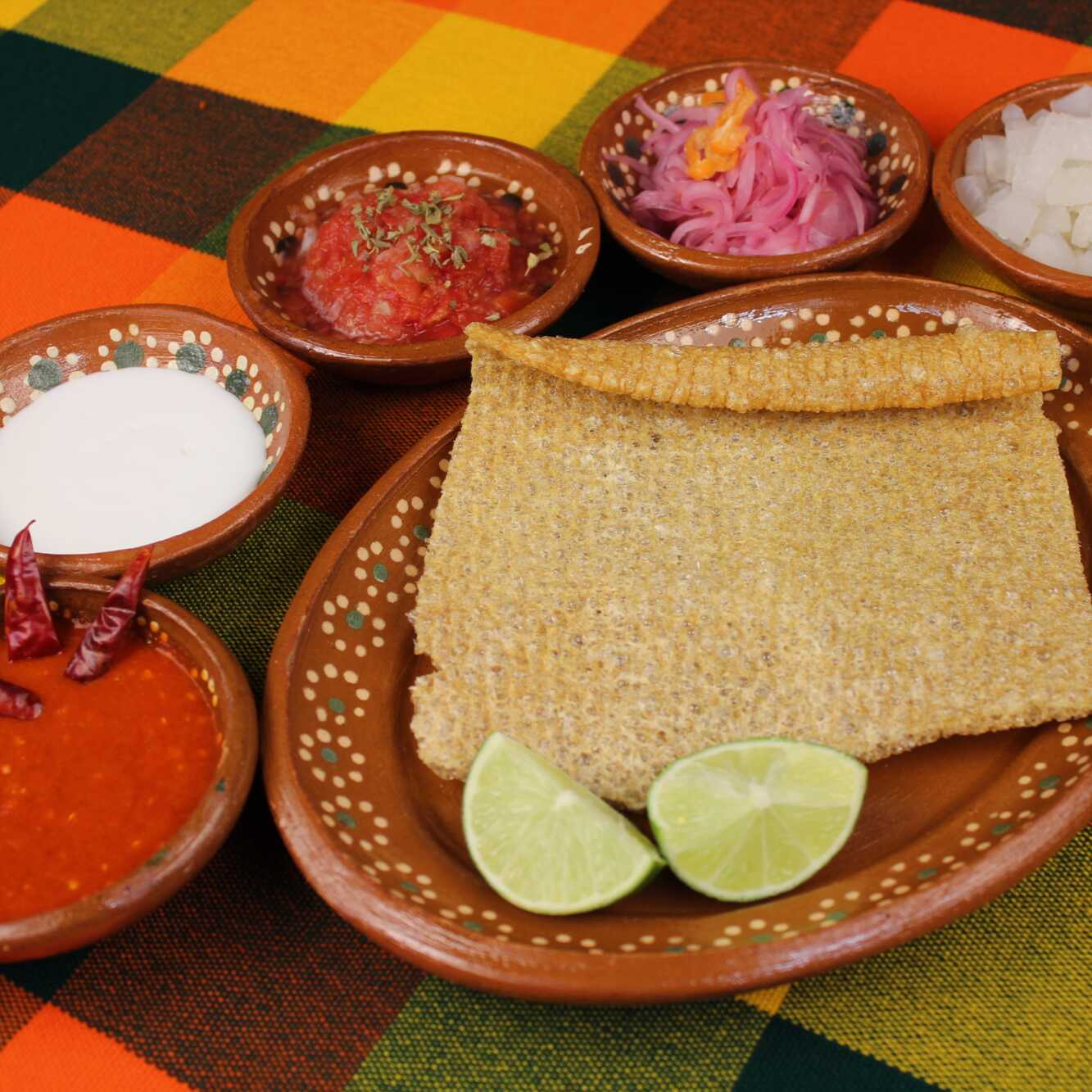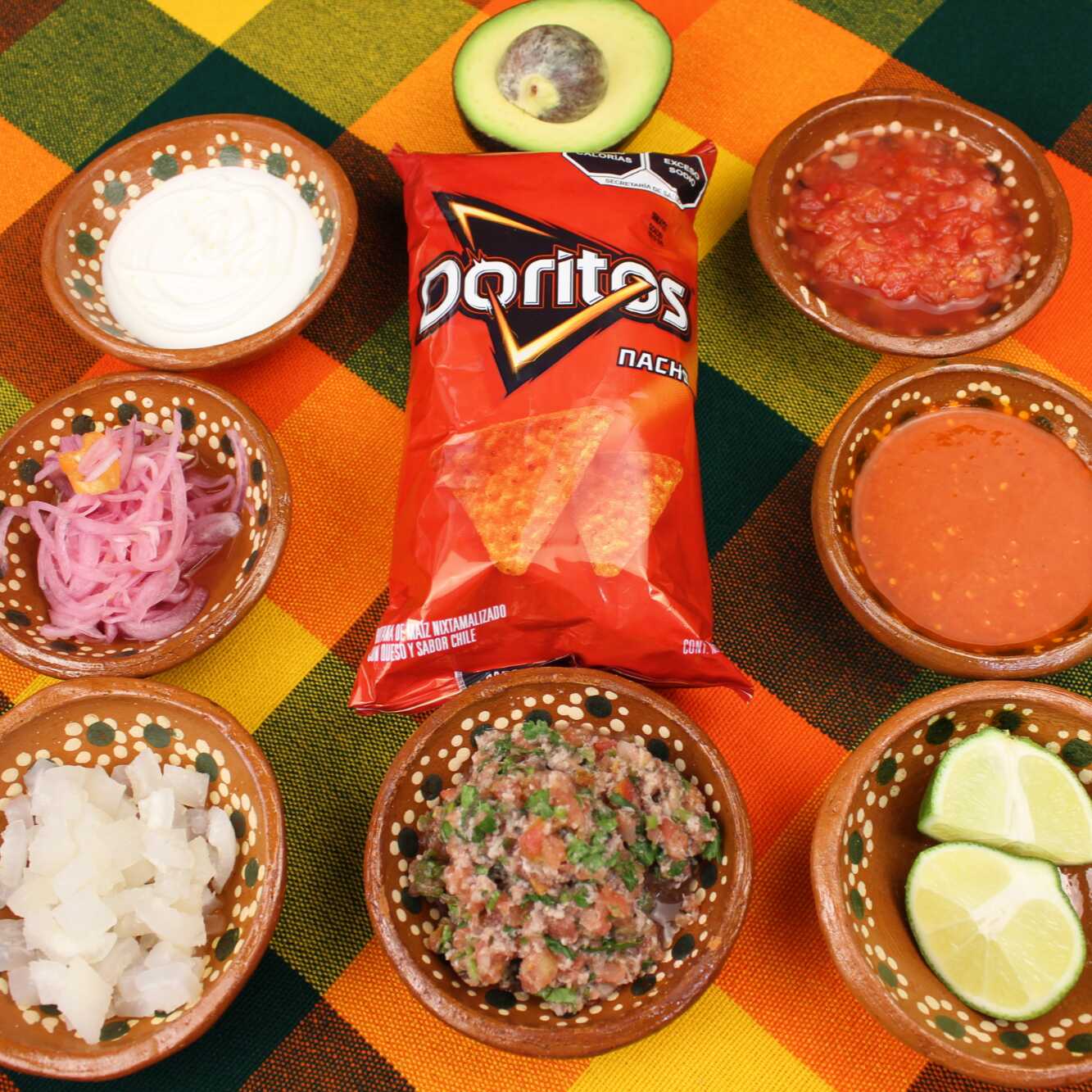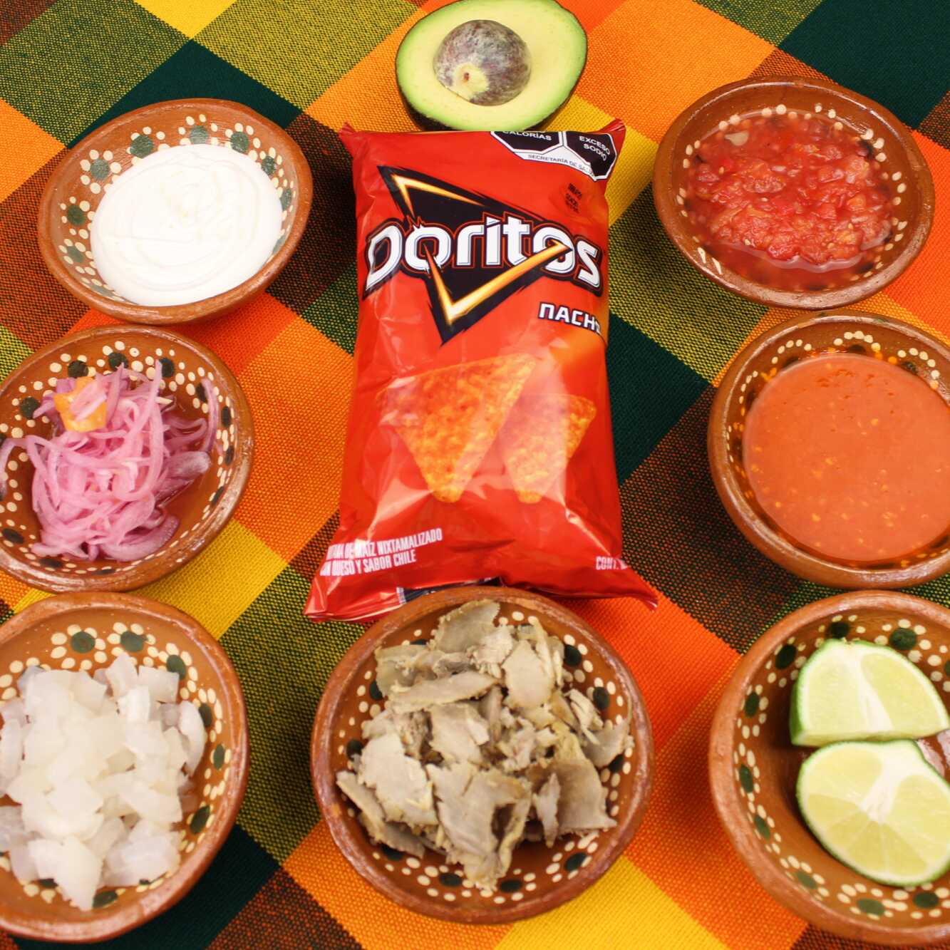 Los tradicionales Doritos acompañados por separado para que te sirvas a tu gusto con salsa picante de árbol, salsa sin picante tipo pico de gallo, cueritos, limón, cebolla morada en habanero y cremita.
