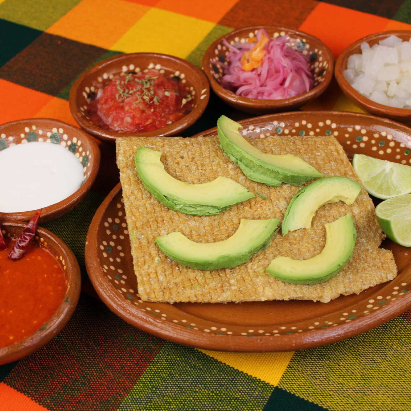 Con aguacatito, acompañado por separado para que te sirvas a tu gusto con salsa picante de árbol, salsa sin picante tipo pico de gallo, cueritos, limón, cebolla morada en habanero y cremita.