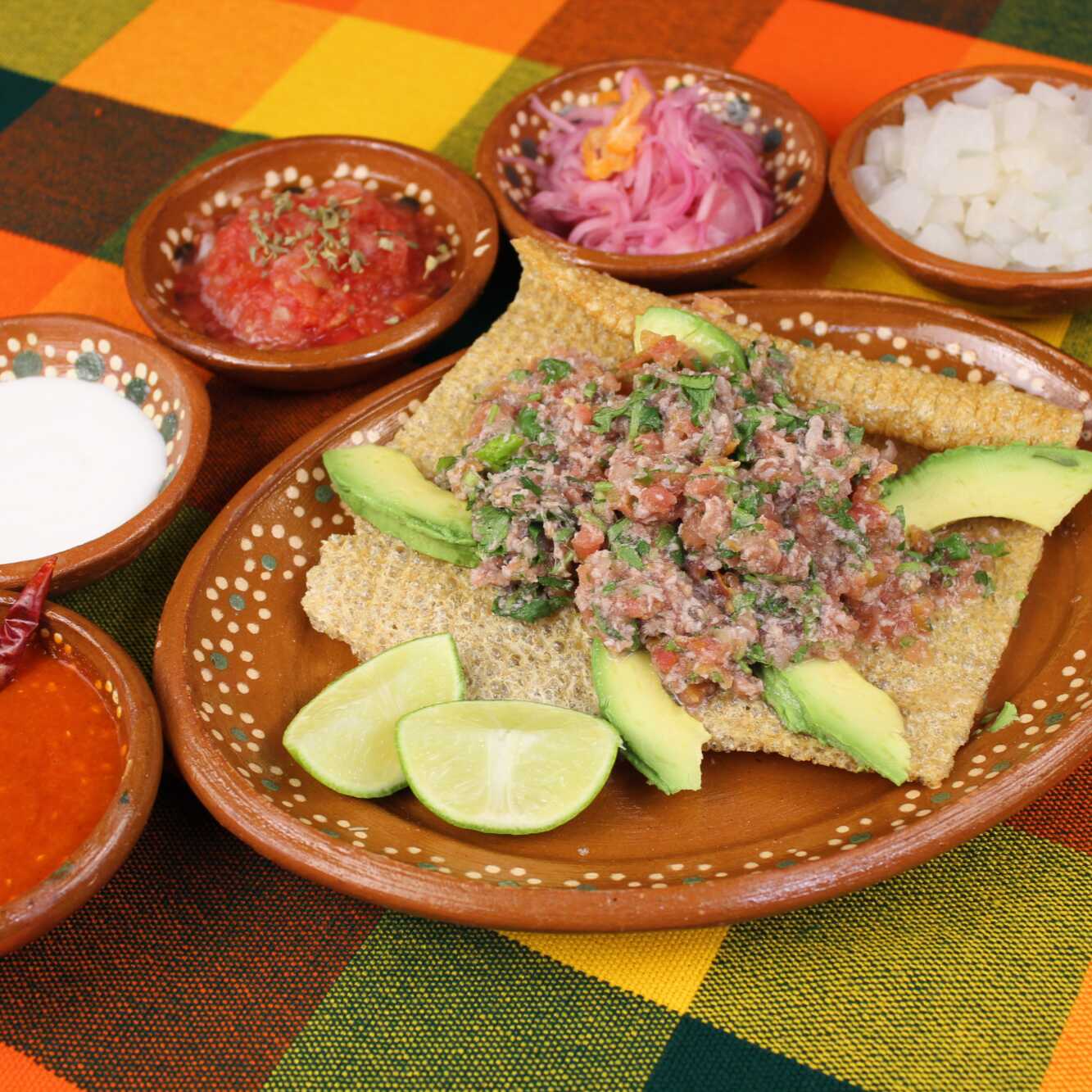 Los tradicionales Doritos con tártara y aguacate, acompañados por separado para que te sirvas a tu gusto con salsa picante de árbol, salsa sin picante tipo pico de gallo, cueritos, limón, cebolla morada en habanero y cremita.