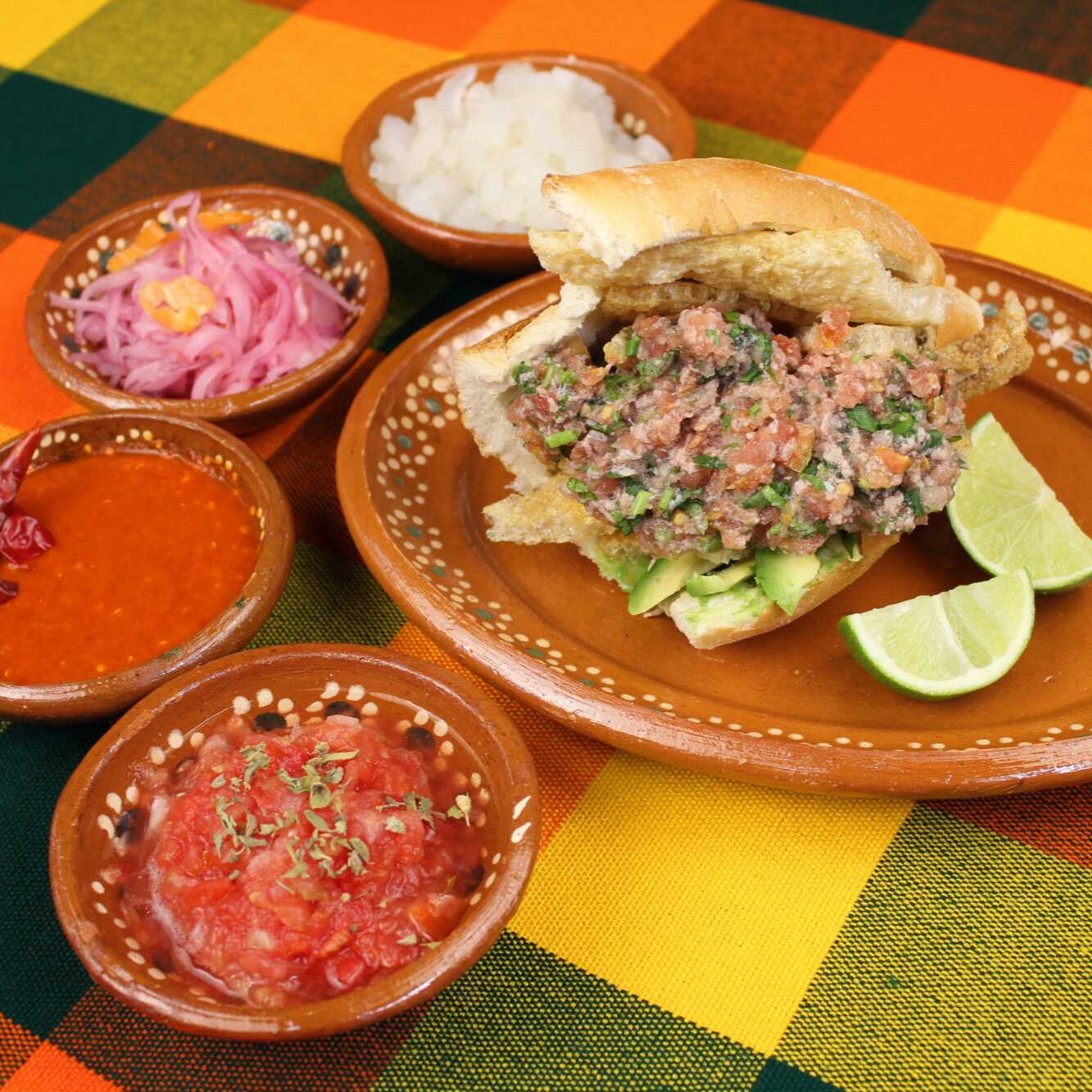Cumple antojo doble, con carne tártara (se envía por separado para que no se remoje) aguacate y duro dentro del bolillo, acompañada por separado para que te sirvas a tu gusto con salsa picante de árbol, salsa sin picante tipo pico de gallo, cueritos, limón y cebolla morada en habanero.