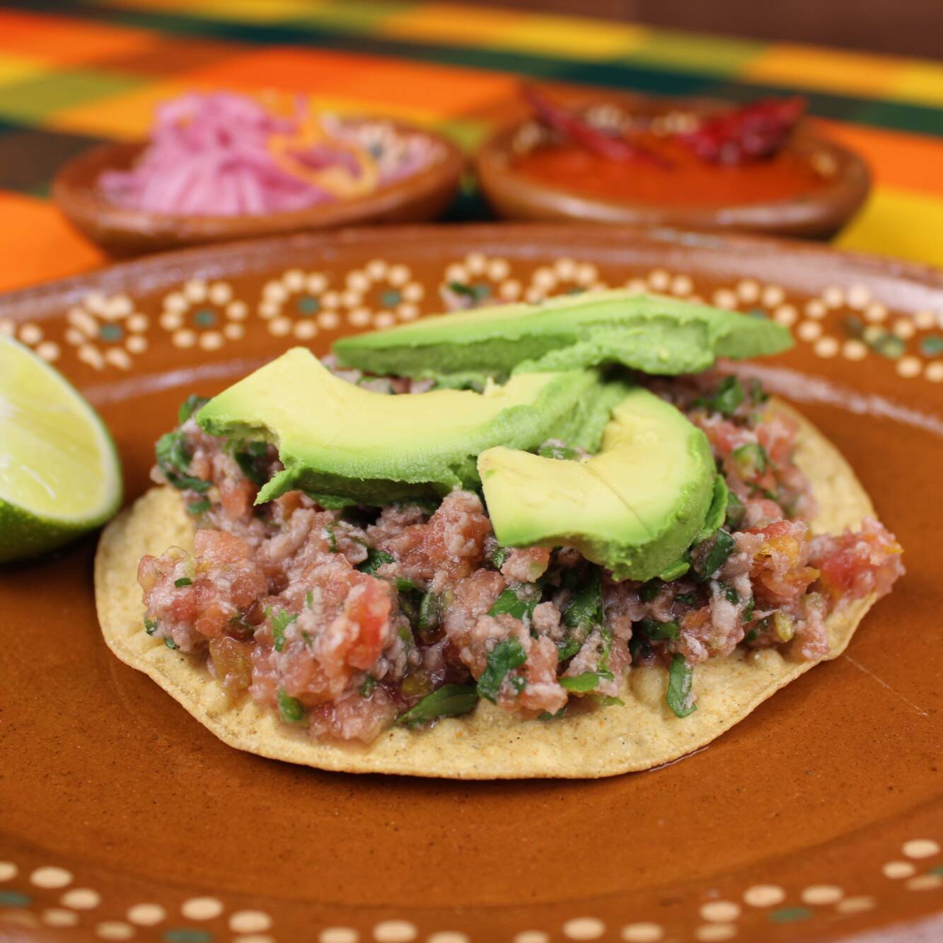 Carne de res molida cocida en limón, mezclada con jitomate, cebolla, cilantro y chile serrano, acompañada de aguacate (la tostada se envía por separado para evitar que se remoje).
