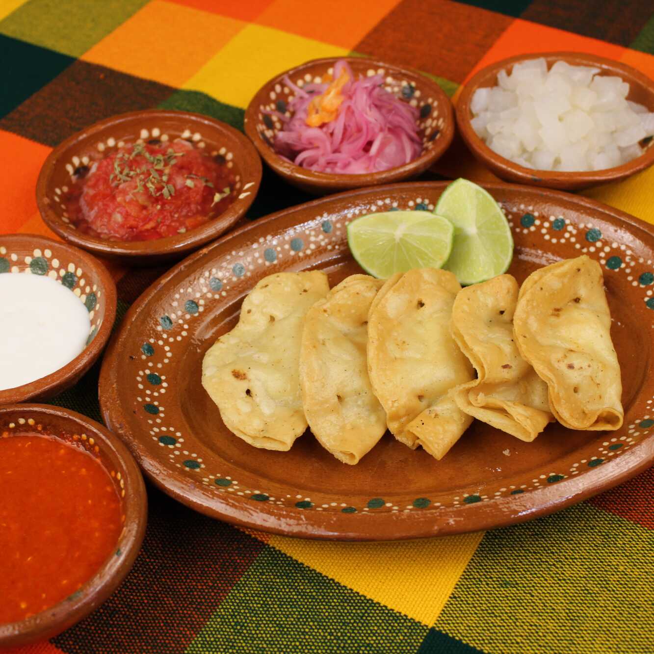 5 Tacos sencillos con relleno a tu elección, acompañados por separado para que te sirvas a tu gusto con salsa picante de árbol, salsa sin picante tipo pico de gallo, cueritos, limón, cebolla morada en habanero y cremita.