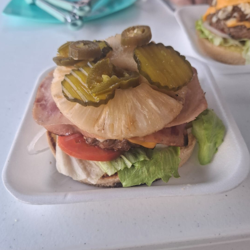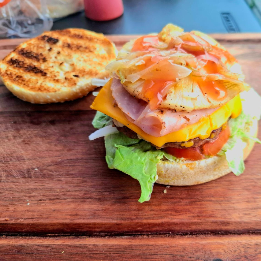 Hamburguesa con carne de res, queso blanco y queso amarillo, jamón y piña, con vegetales (lechuga, jitomate, cebolla, cebolla asada) , y aderezos (crema, mayoneza, moztasa, catsup y chimichurri)