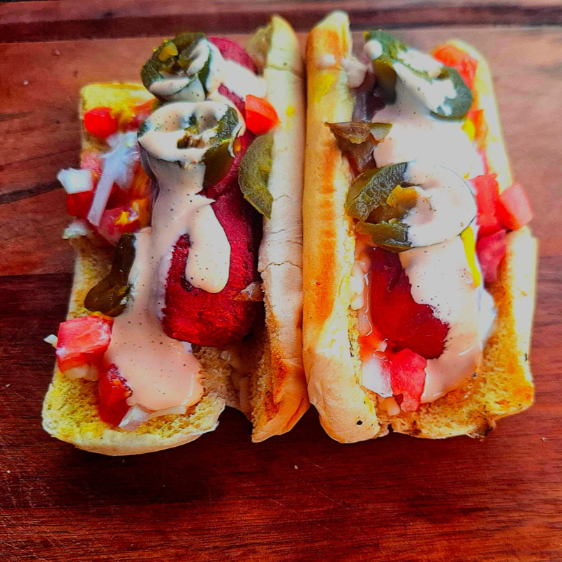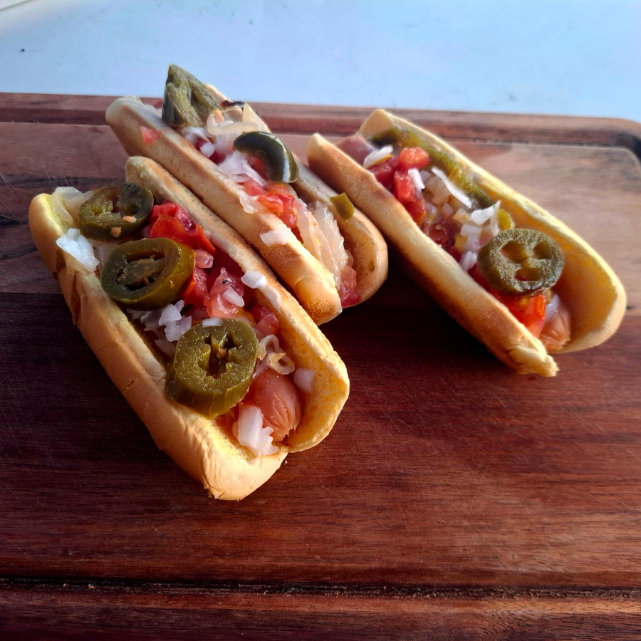 Hot Dog Sencillo: salchicha, con jitomate, cebolla, jalapeños y cebolla asada, aderezos crema, mostaza, mayonesa, catsup y chimichurri