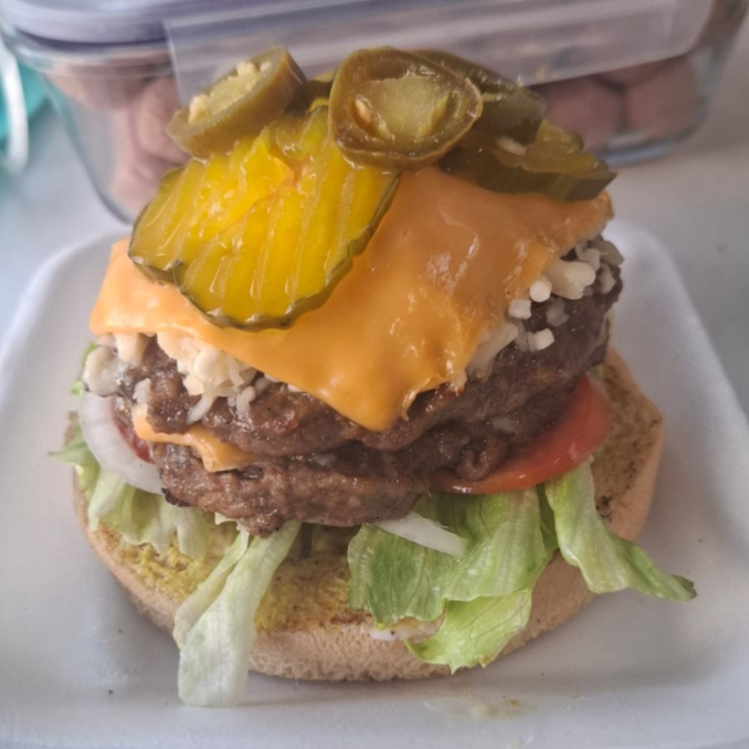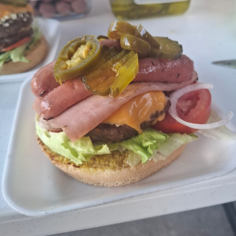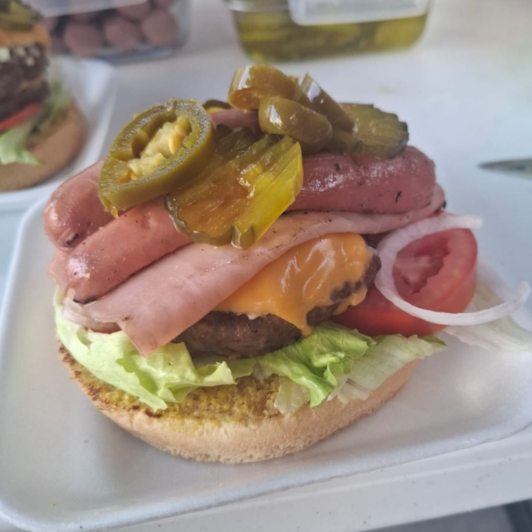Hamburguesa con doble carne de res,doble queso blanco y doble queso amarillo, jamon y salchicha, con vegetales (lechuga, jitomate, cebolla, cebolla asada) , y aderezos (crema, mayoneza, moztasa, catsup y chimichurri)