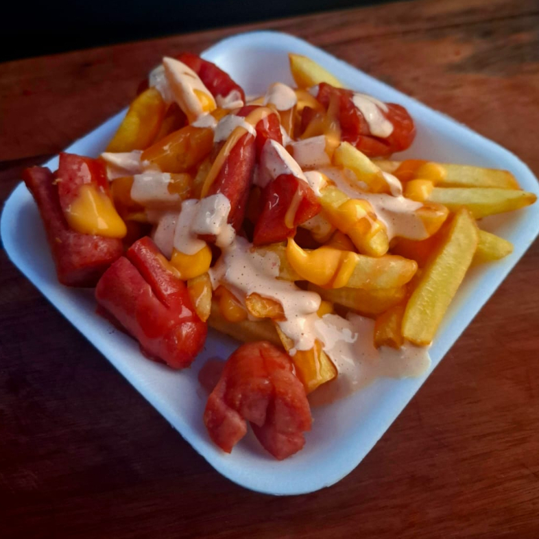 Salchichas cortadas en forma de pulpo con papas a la francesa y aderezos