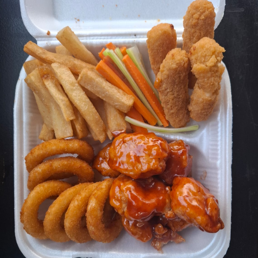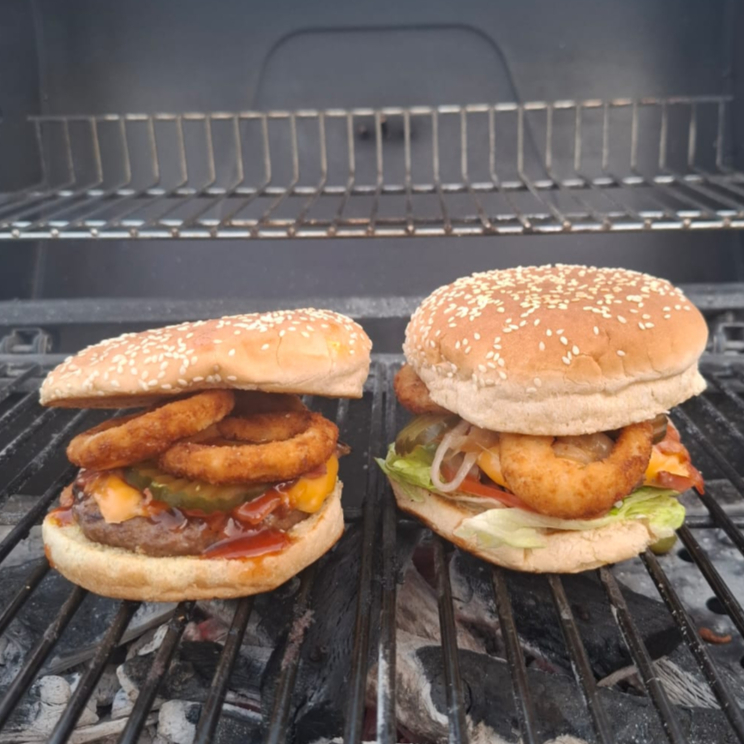 Hamburguesa con carne de res, queso blanco y queso amarillo, Salsa BBQ, Aros de cebolla, lechuga, jitomate, cebolla cebolla asada, crema, mayonesa y ranch
