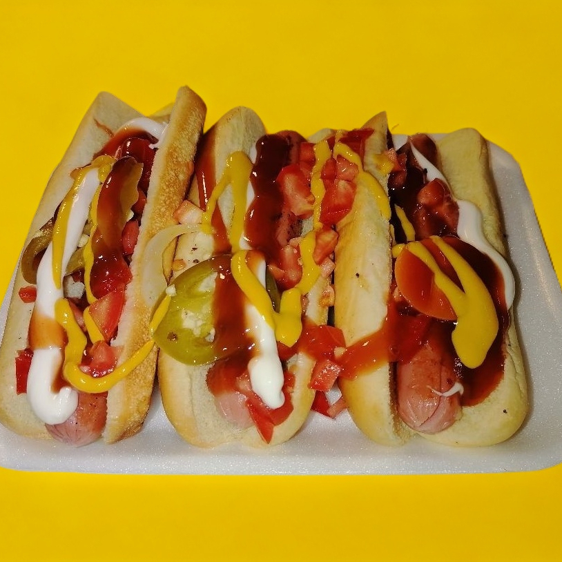 3 hot-dogs Jitomate, cebolla, chile jalapeño, cátsup, crema, chimichurri y mostaza.