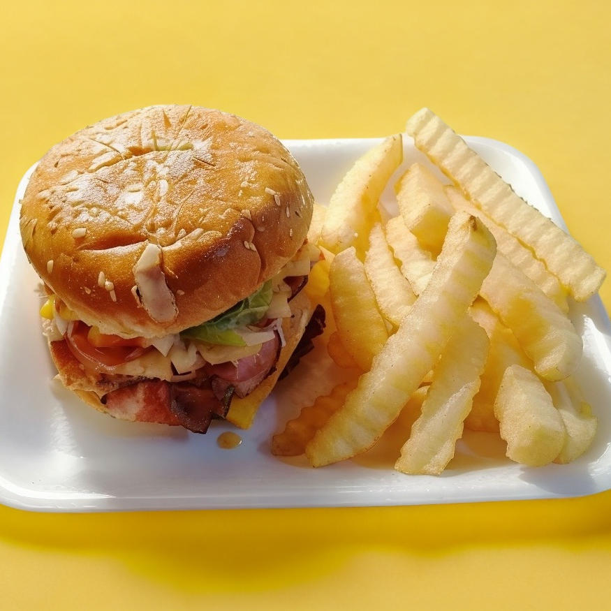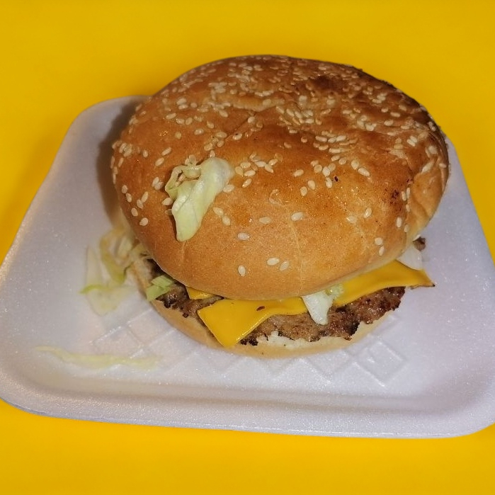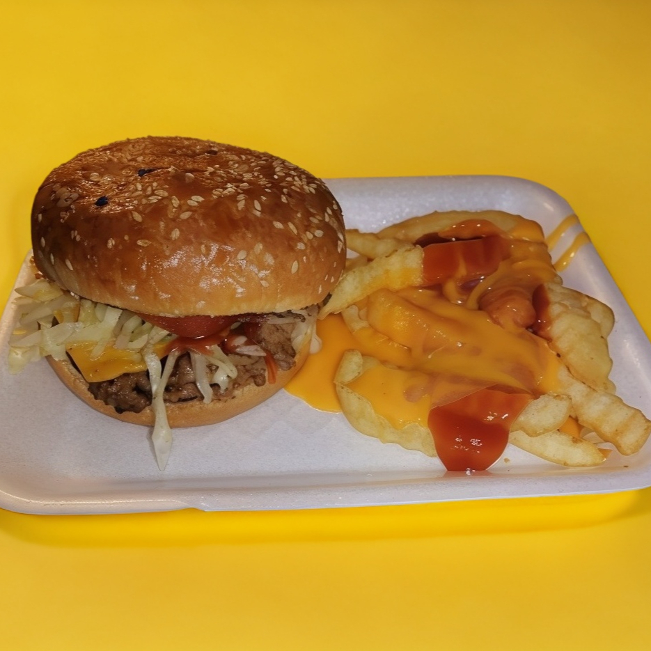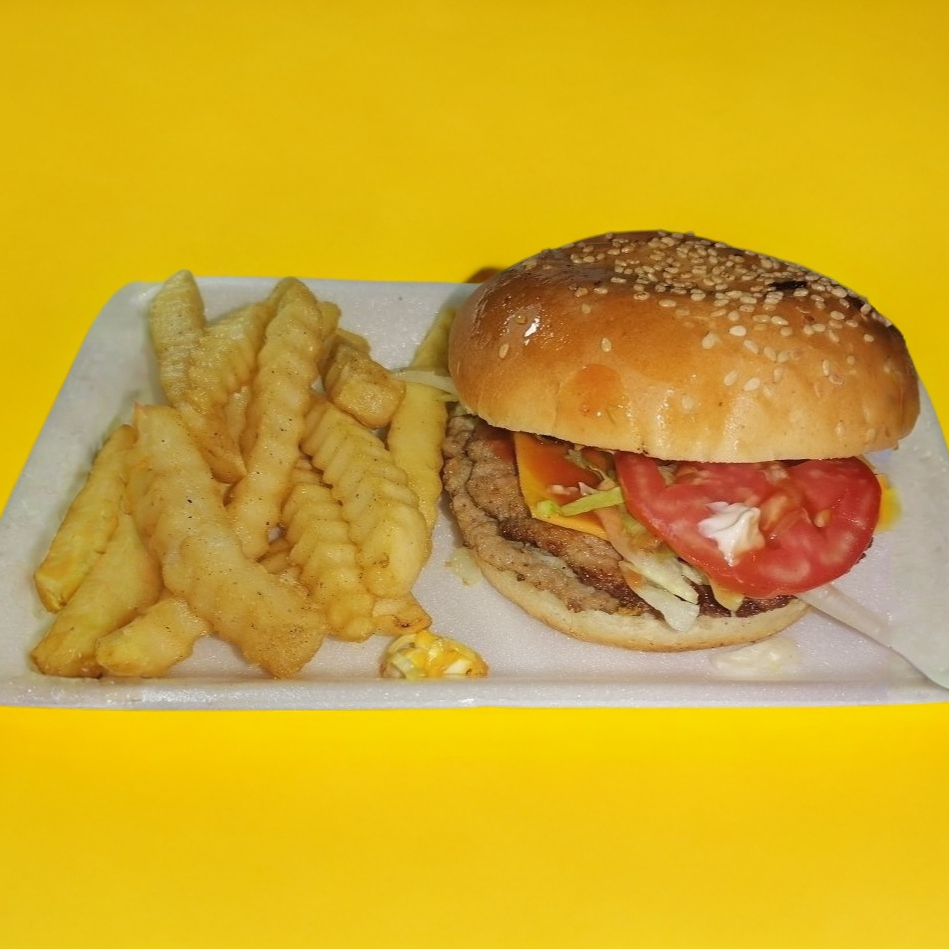 Pan grande con 30 g de carne 100% de res, queso amarillo rebanado, lechuga, jitomate, cebolla, chile jalapeño, cátsup, crema, chimichurri y mostaza. Acompañado de una guarnición de papas fritas.