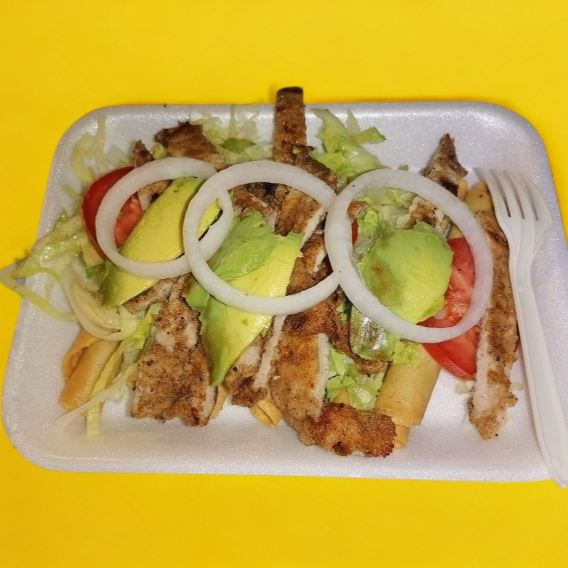 6 flautas rellenas de pollo con milanesa de cerdo encima. Lechuga, aguacate, jitomate, cebolla, crema y salsa verde aparte.